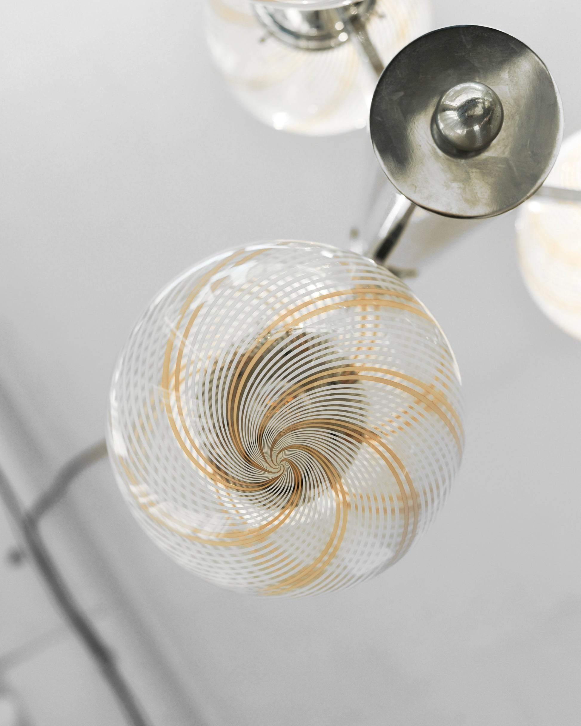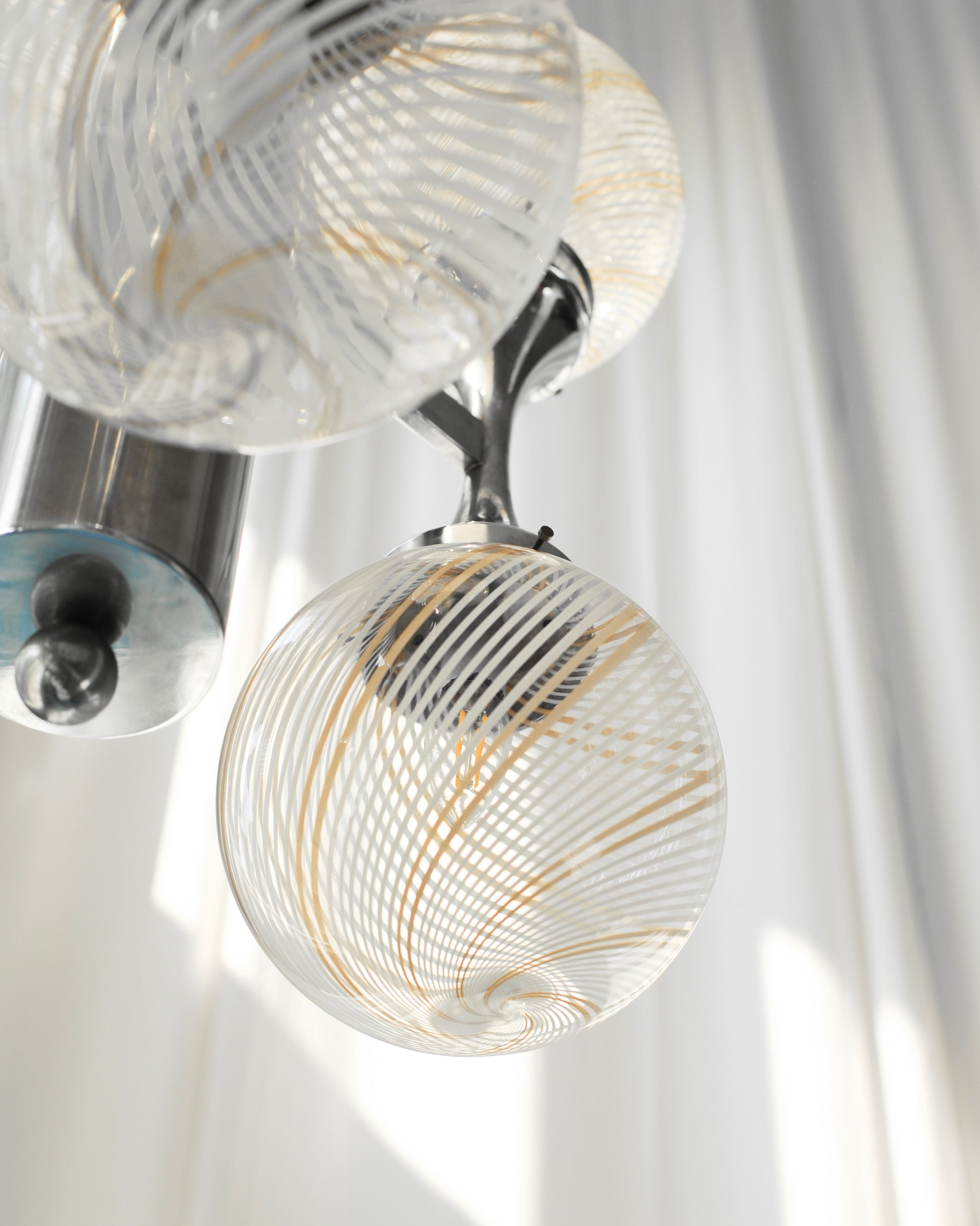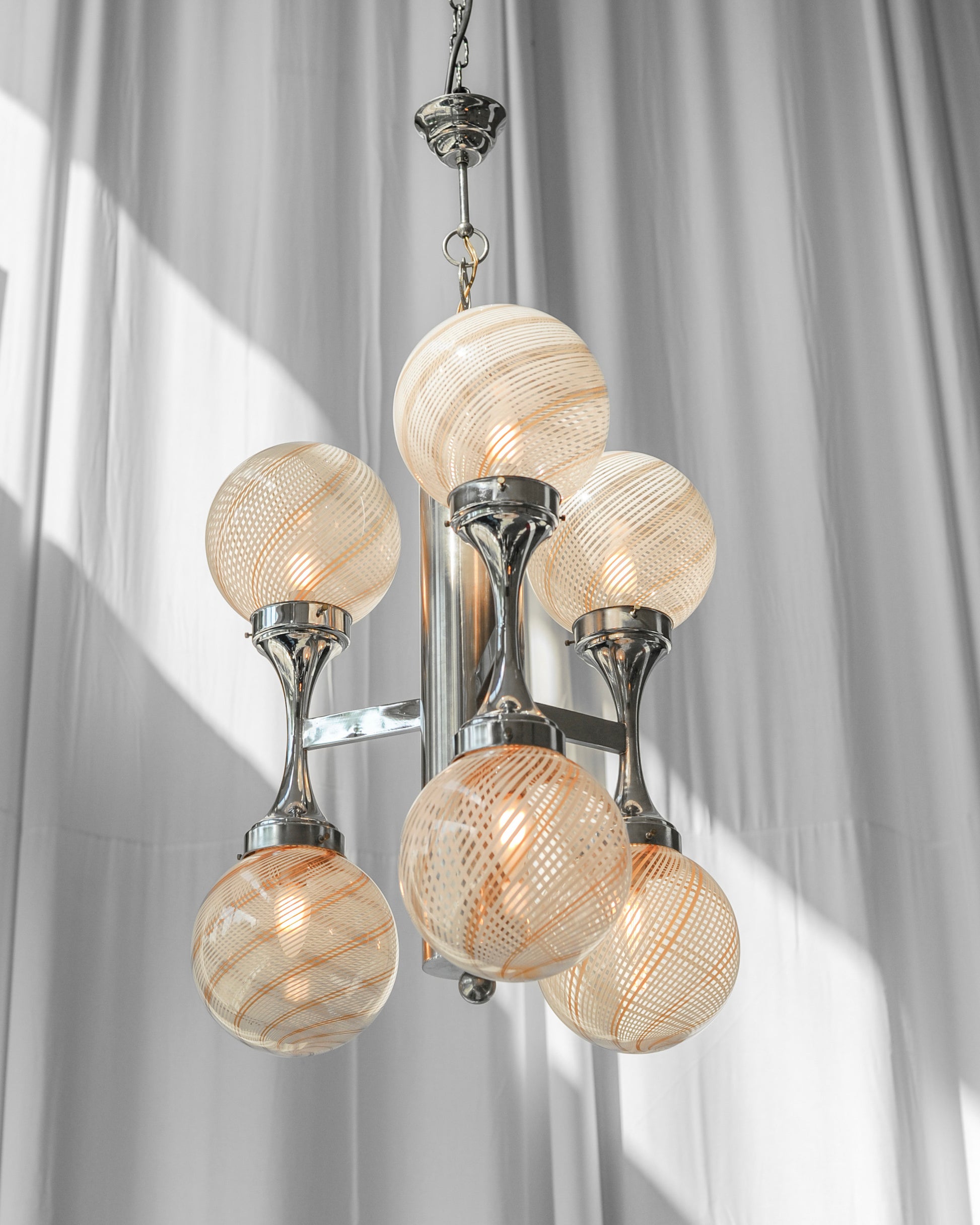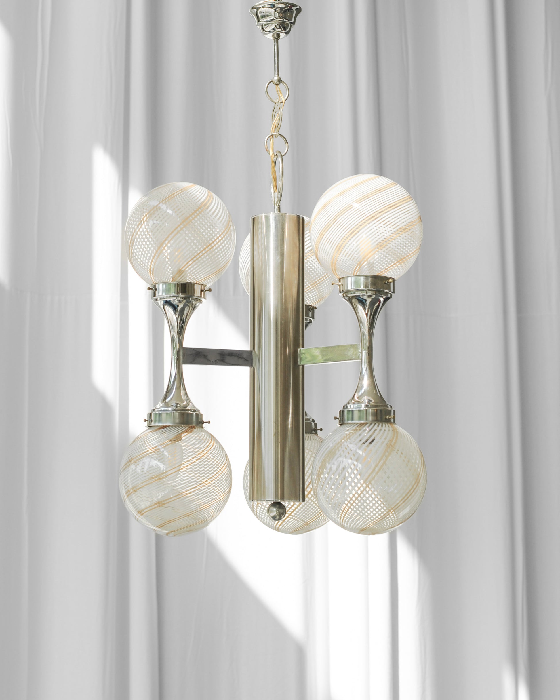 Chrómový luster sme doviezli z Talianska. Má 6 tienidiel vyrobených z muránskeho skla. Sklo je priehľadné a má jemné pásiky bielej a béžovej farby. Jeho dizajn bol inšpirovaný vesmírom a je predstaviteľom tzv. space age dizajnu. Luster bol skontrolovaný elektrikárom a je plne funkčný.