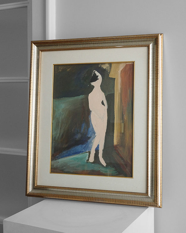 Tento originálny vintage obraz sme objavili na talianskej burze, kde nás zaujal svojou jedinečnou atmosférou. Jemná farebná harmónia v odtieňoch modrej a hnedej spolu s výrazným kontrastom bielej figúry robí z diela nadčasový kúsok. Obraz je osadený v kvalitnom drevennom ráme s jemnou patinou, ktorý podčiarkuje jeho charakter.
