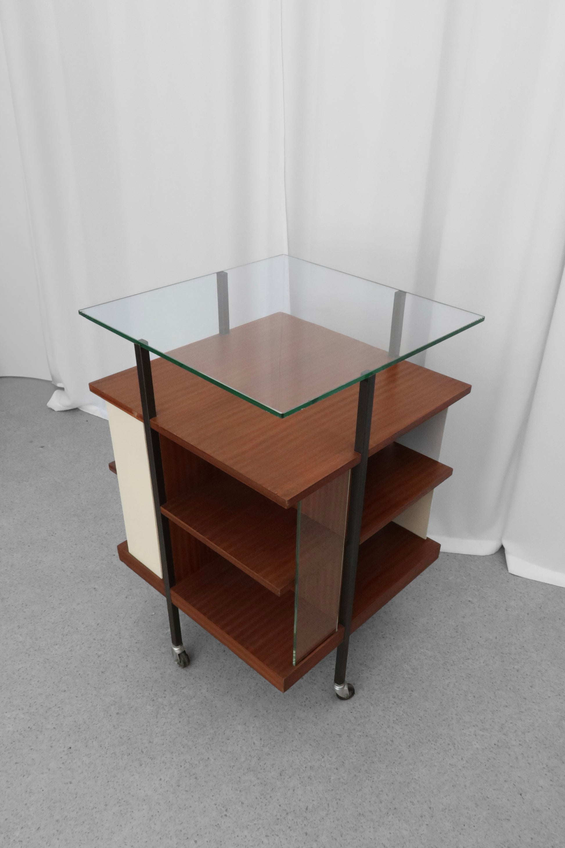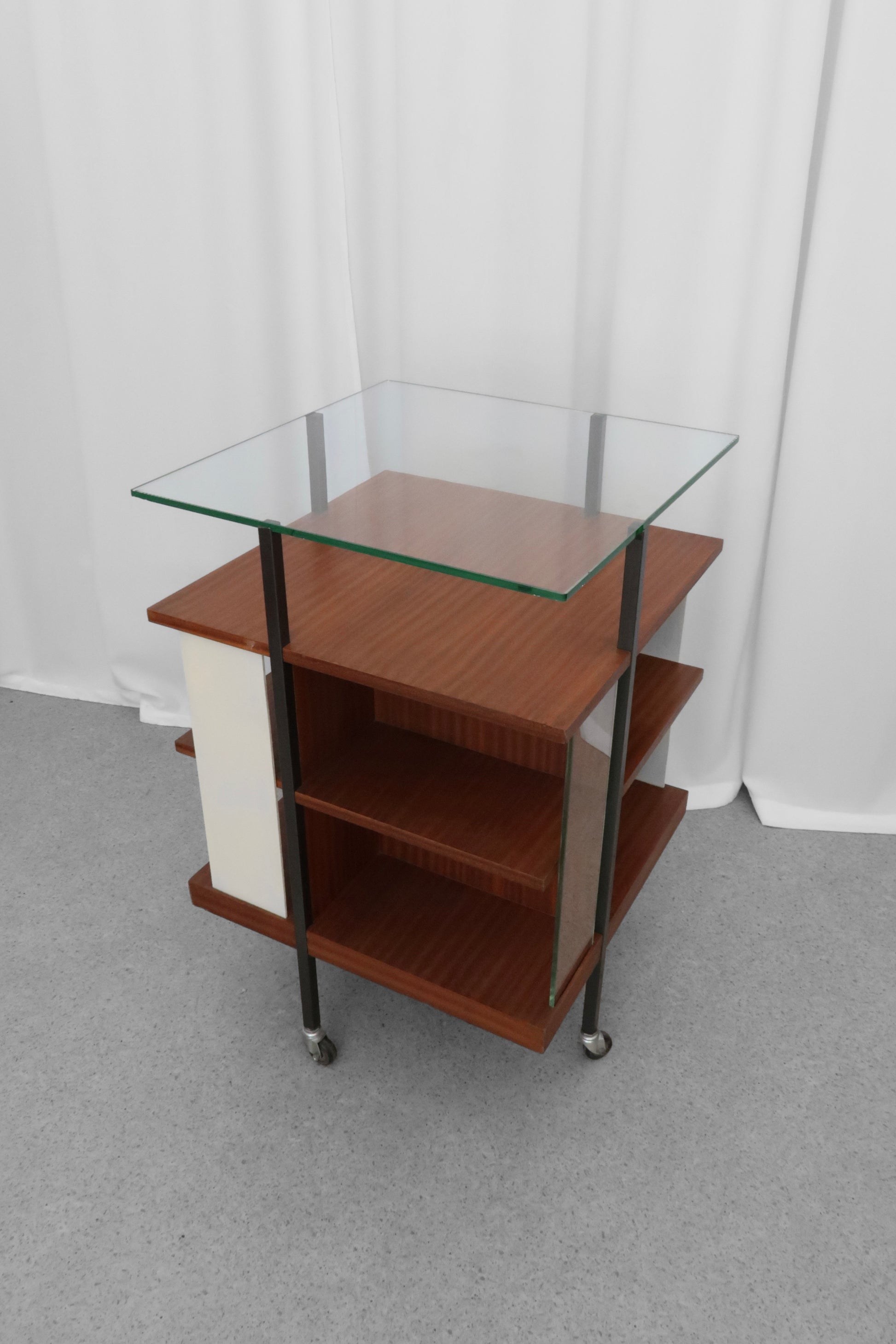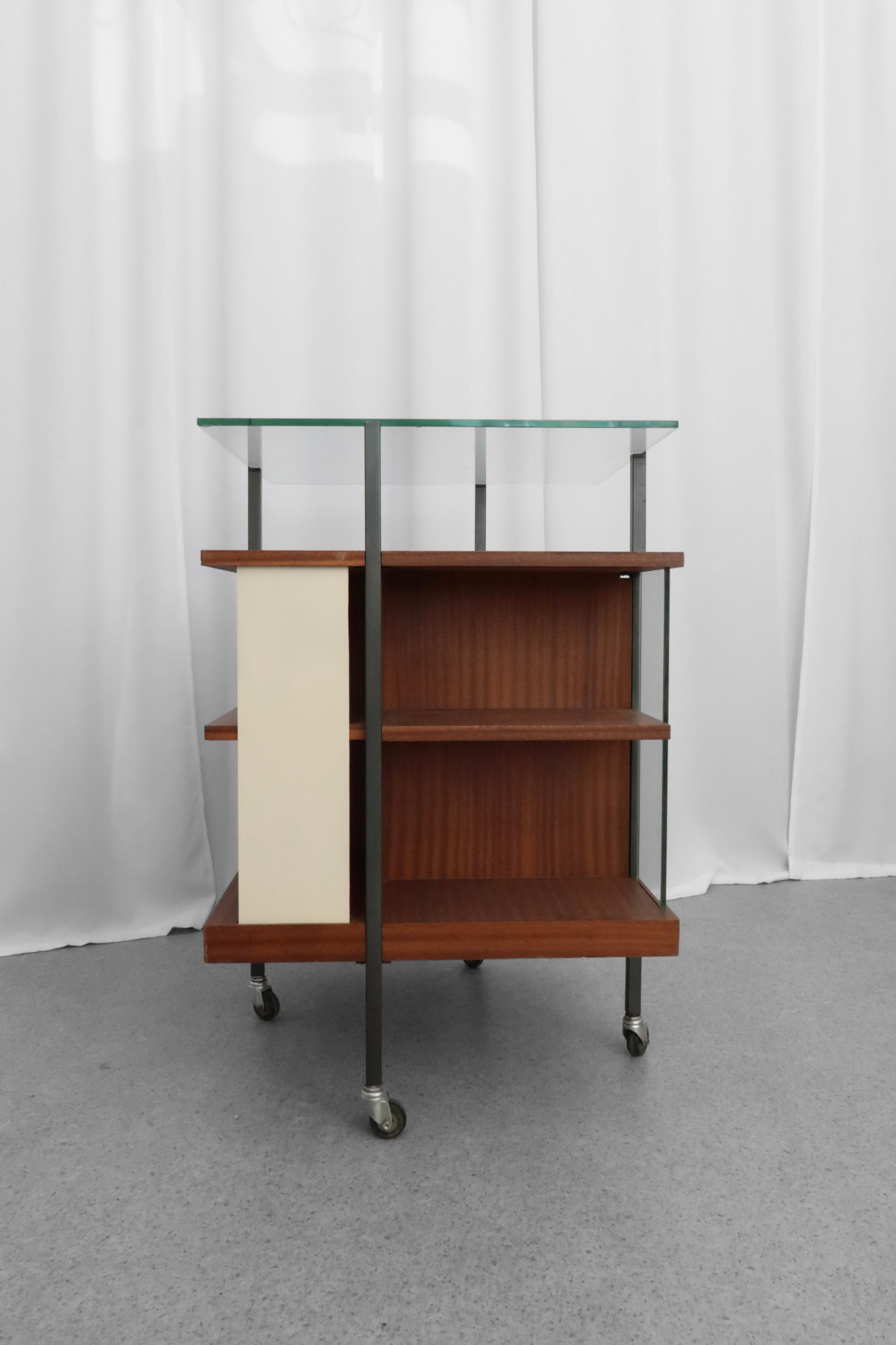Tento mobilný kabinet zo 60. rokov kombinuje drevenú a kovovú konštrukciu s praktickými kolieskami a sklenenou vrchnou doskou. Otvorený priestor umožňuje vystavenie predmetov zo všetkých strán, takže funguje skvele ako knižnica, vitrína alebo prezentačný kus v interiéri. Drevená konštrukcia je z mahagónového dreva. Mid-century dizajn a zaujímavé spracovanie robia z tohto kusu funkčný aj esteticky výrazný doplnok. Kabinet je vo veľmi peknom vintage stave, s jemnou patinou.