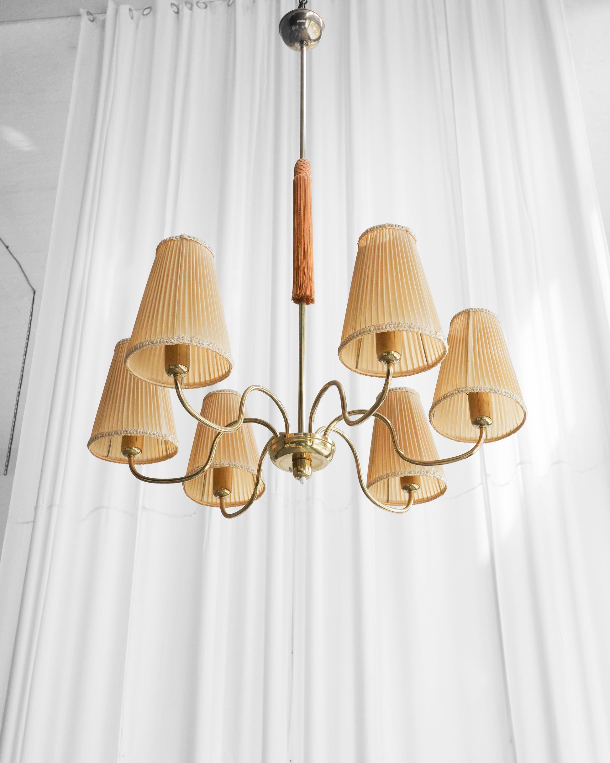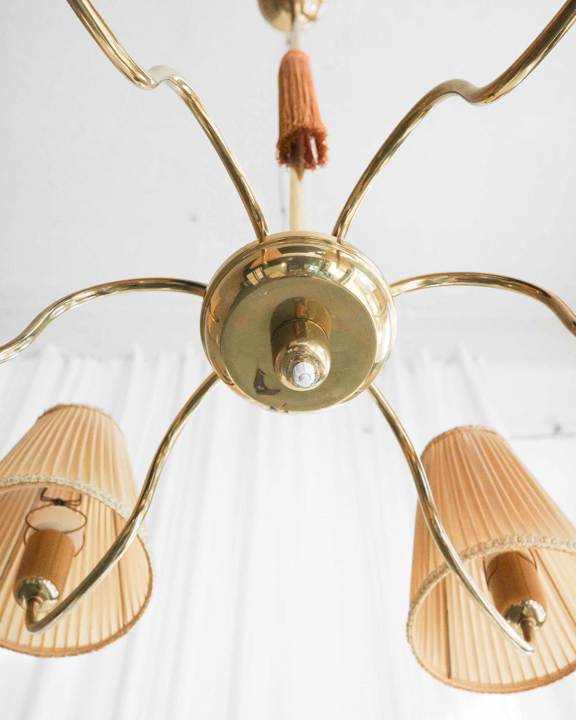 Mid-century luster pochádza pravdepodobne z Rakúska, má mosadznú konštrukciu a šesť ramien. Priamo na žiarovkách sú umiestnené elegantné tienidlá. Luster bol skontrolovaný elektrikárom a je plne funkčný.