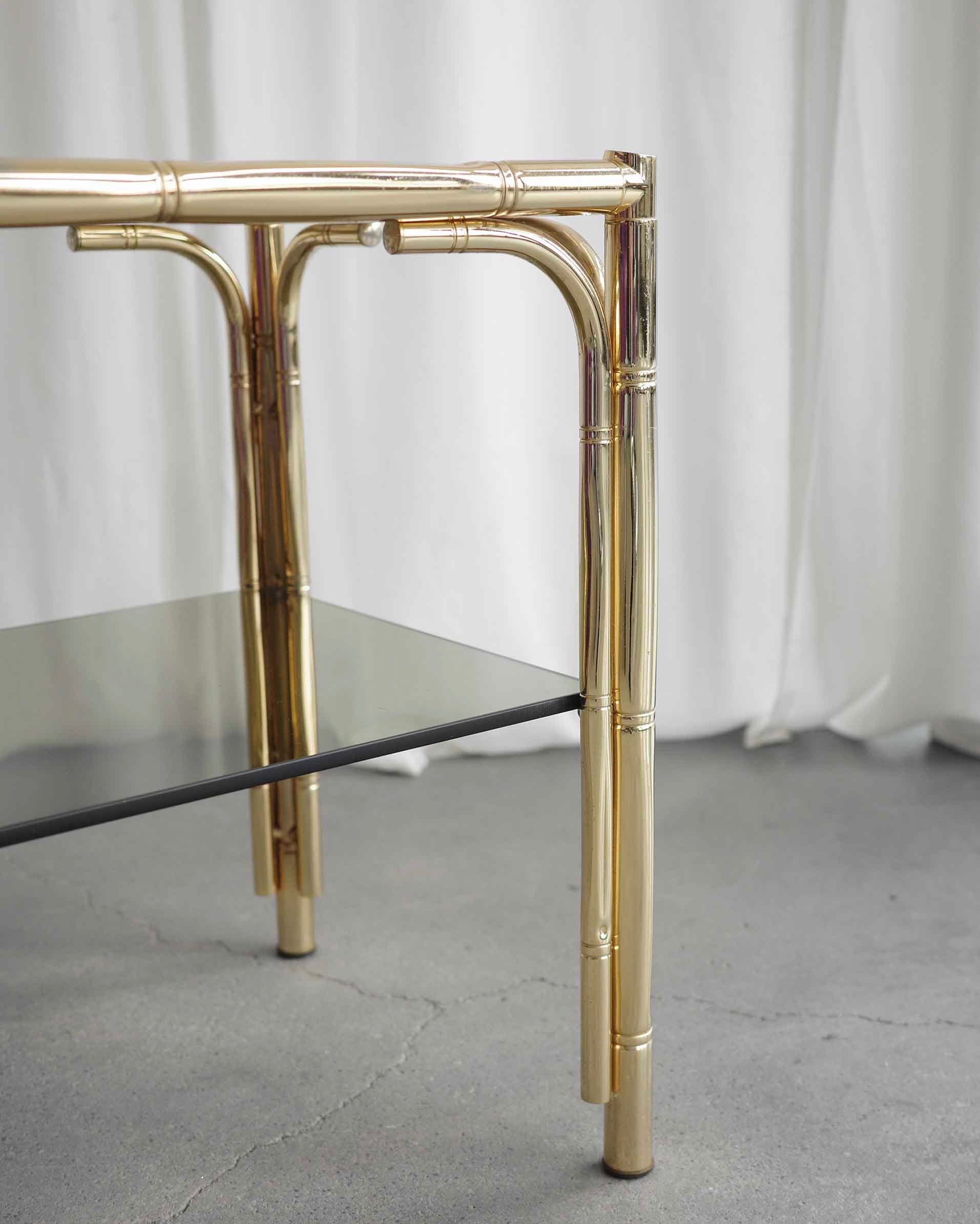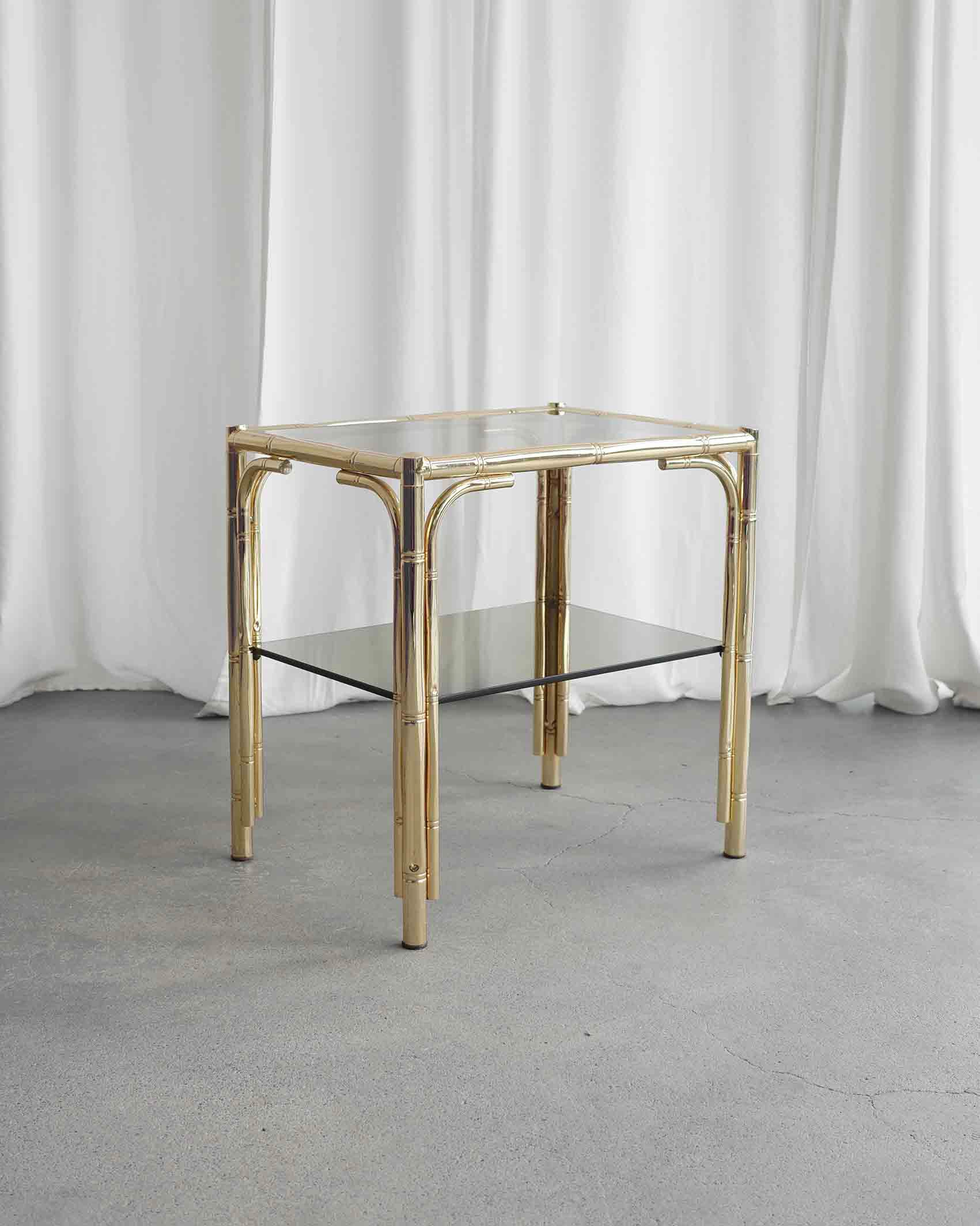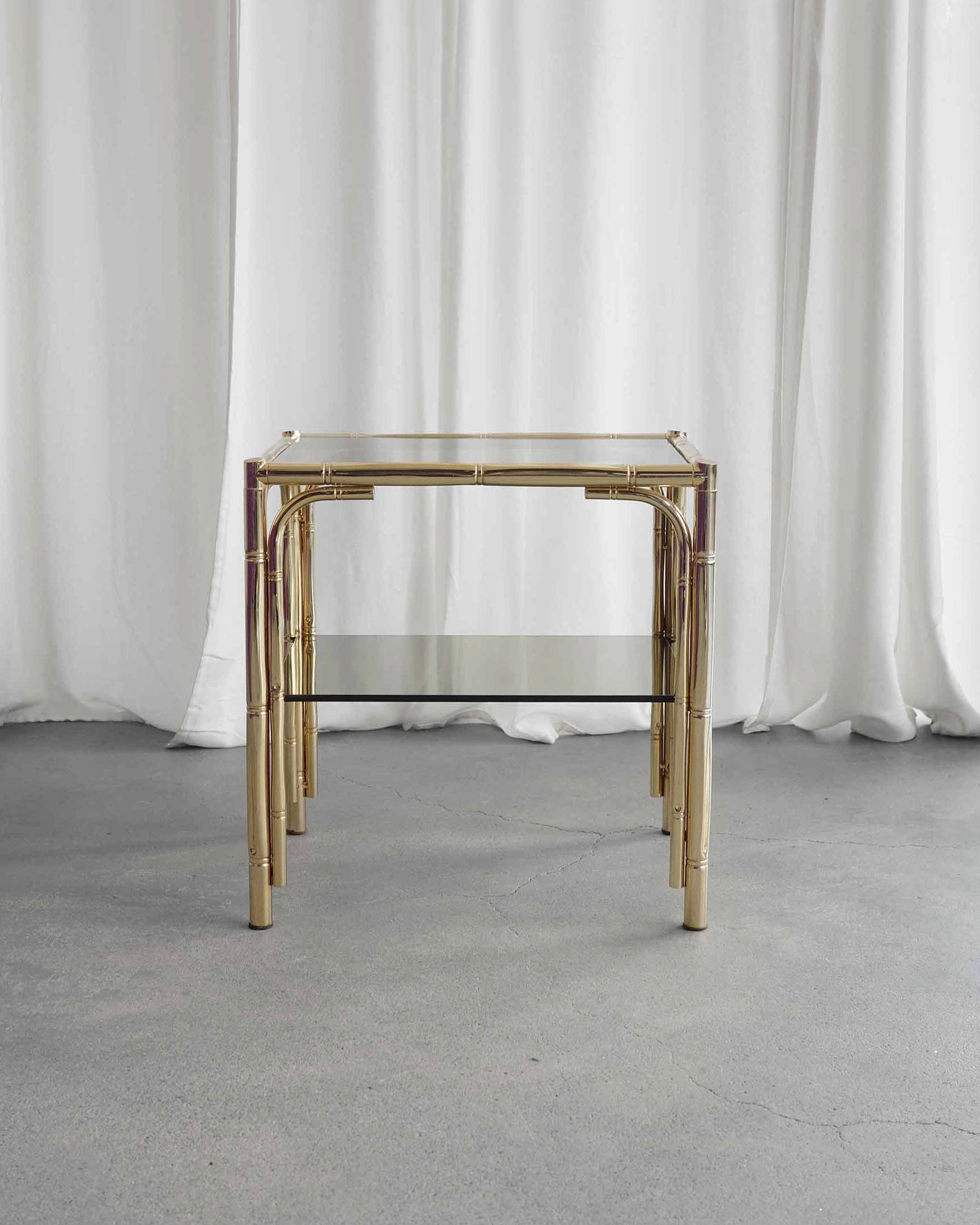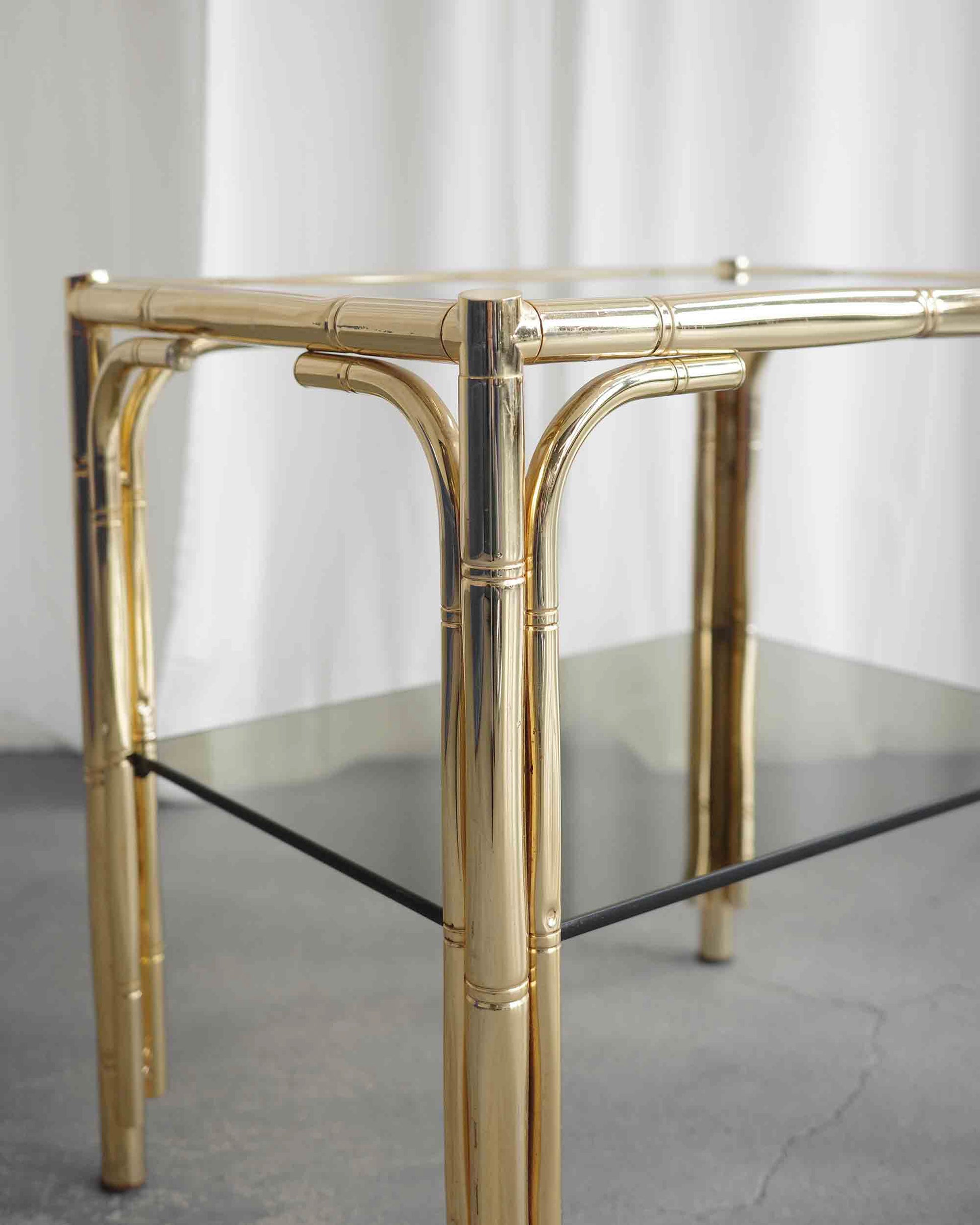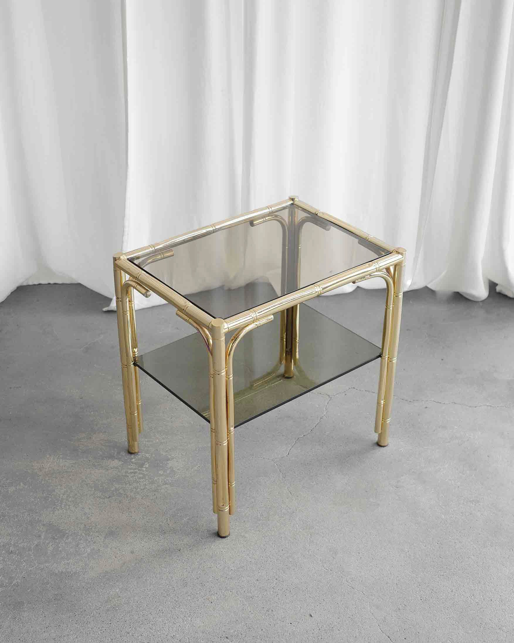 Francúzsky príručný mosadzný stolík zo pripomínajúci bambus. Stolík má dve police z dymové skla.