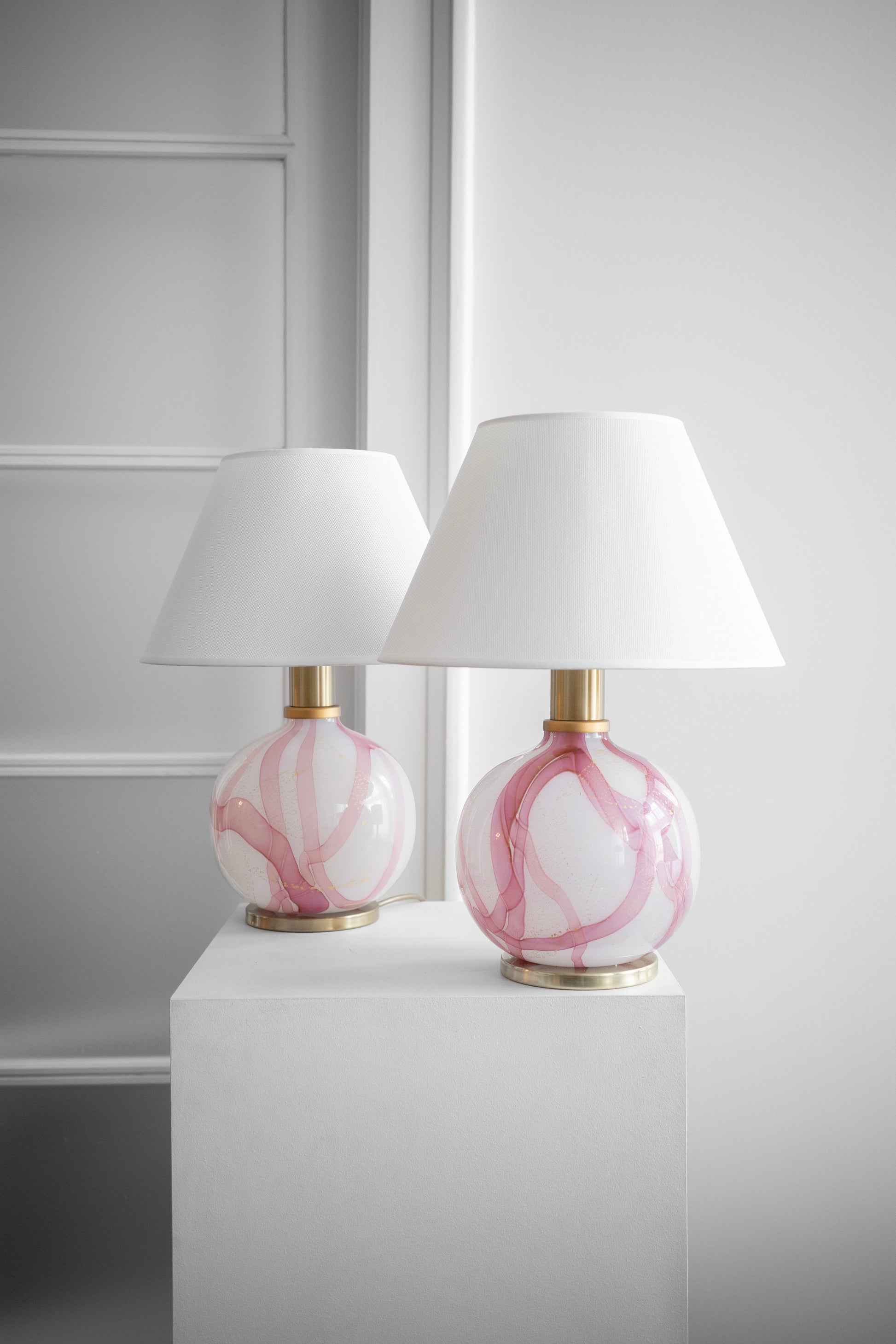 Krásne muránske lampy z 80. rokov s ručne fúkaným sklom v jemnej ružovej farbe so zlatým prachom. Mosadzné detaily a nové biele tienidlá. Priniesli sme ich z Talianska.