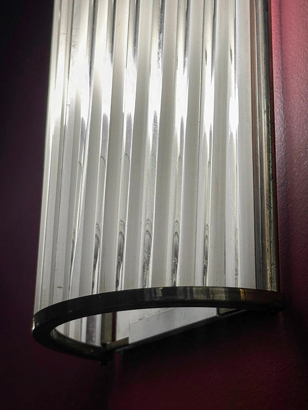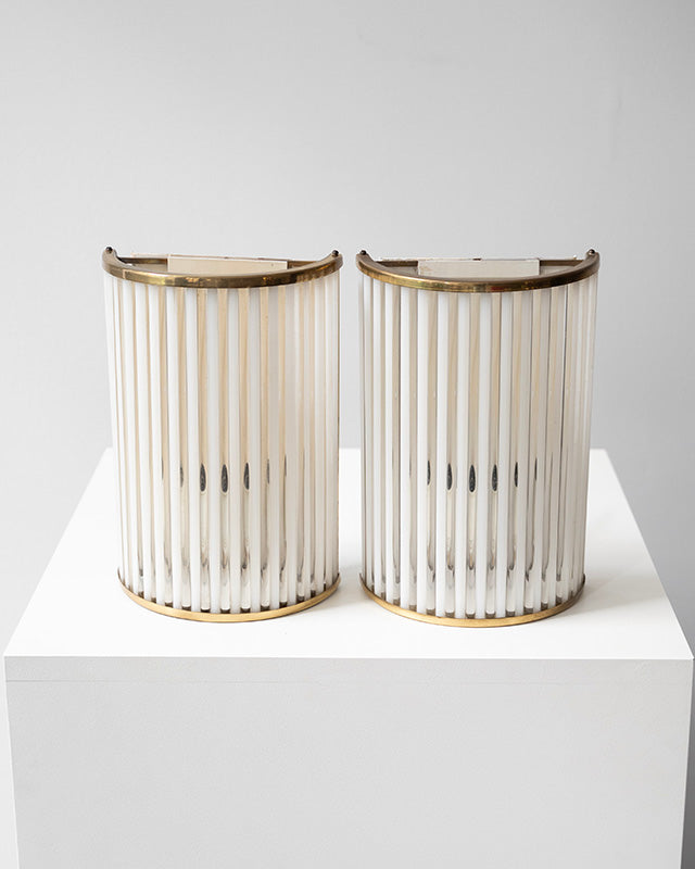 Elegantné art deco nástenné lampy pochádzajú zo 40. tych rokov. Tienidlo je osadené ručne fúkanými sklenenými tyčami z Murana - v kombinácii číreho a mliečneho skla. Osadené sú v mosadznom ráme. Do priestoru vnášajú jemnú geometriu a talianske remeslo. Boli skontrolované elektrikárom a sú plne funkčné. V každej sa nachádza objímka E27.