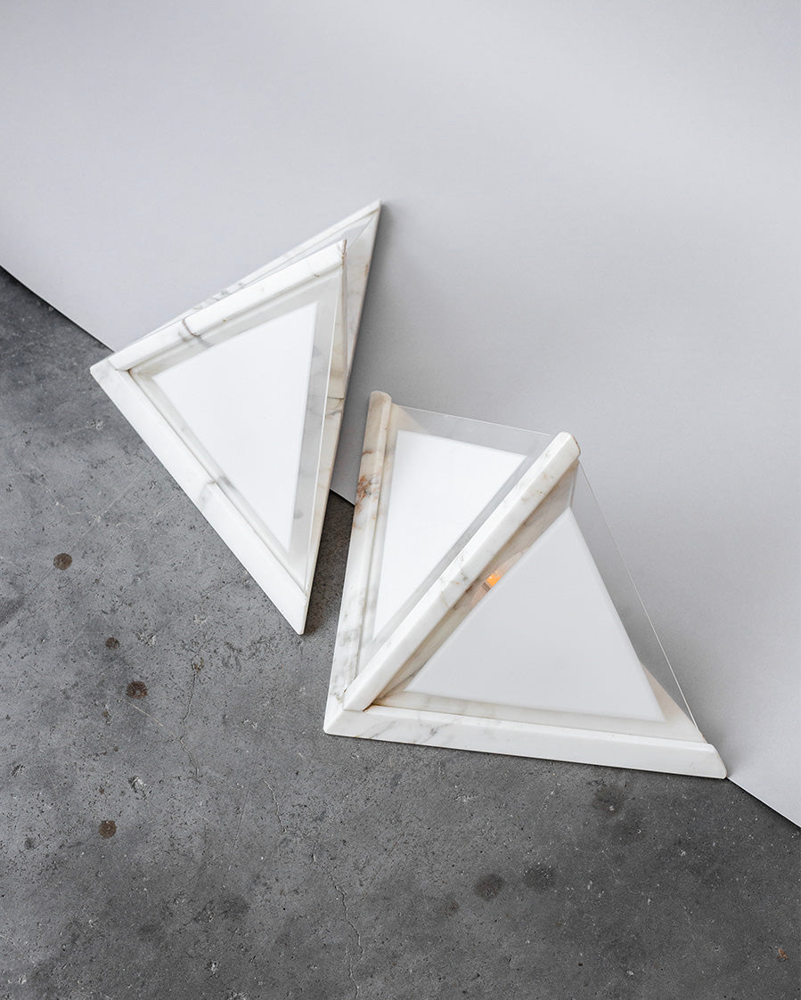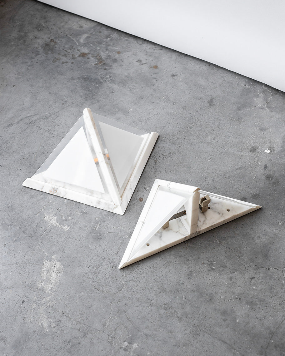 Lampy majú konštrukciu z bieleho carrara mramoru a sklenené výplne z mliečneho skla. Doviezli sme ich z Talianska a odhadujeme, že pochádzajú zo 70tych rokov. Sú určené na montáž na stenu. Boli skontrolované elektrikárom a predávajú sa spoločne s novými LED žiarovkami. Uvedená cena je za pár.