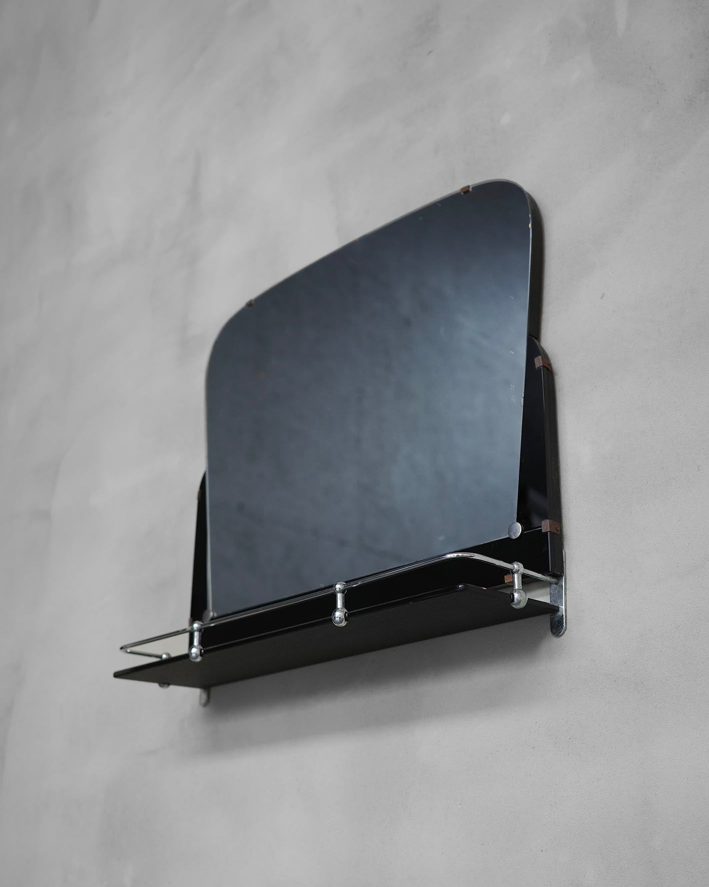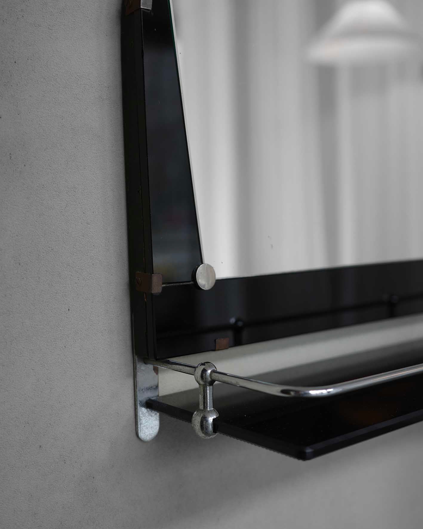 Nástenné zrkadlo s poličkou z opaxitu. Minimalistický tvar, kovové detaily a praktická polička odrážajú estetiku modernizmu 50. a 60. rokov. Jeho vzhľad ho predurčuje na využitie v predsieni alebo kúpeľni.