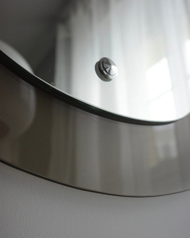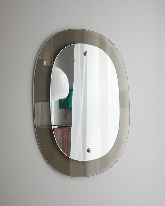 Talianske oválne zrkadlo pochádza zo 70. rokov. Zrkadlo má sklenený rám z dymového skla a je svojím zjavom je veľmi univerzálnym doplnkom do interiéru. Je vo výbornom stave, bez patiny a doviezli sme ho z Talianska.