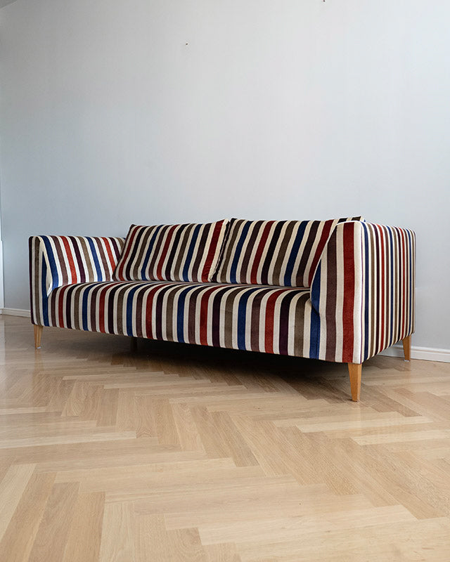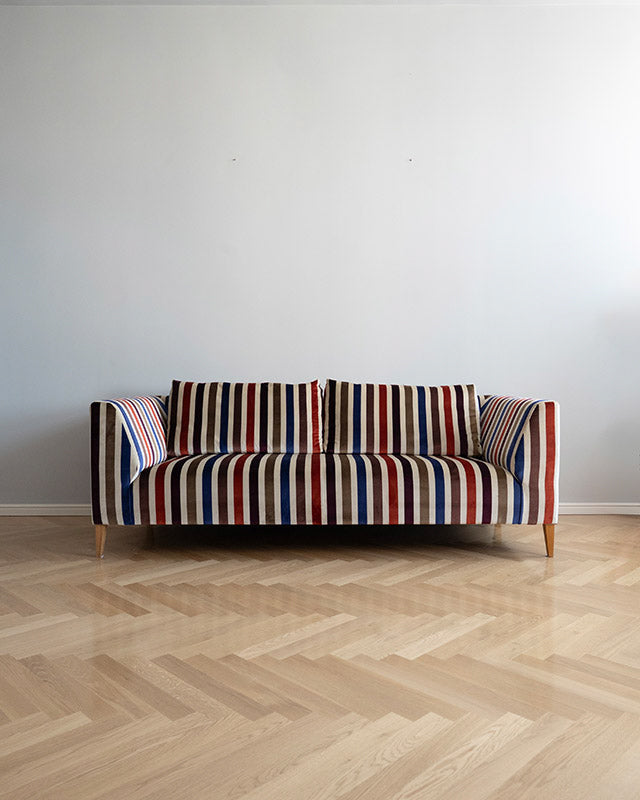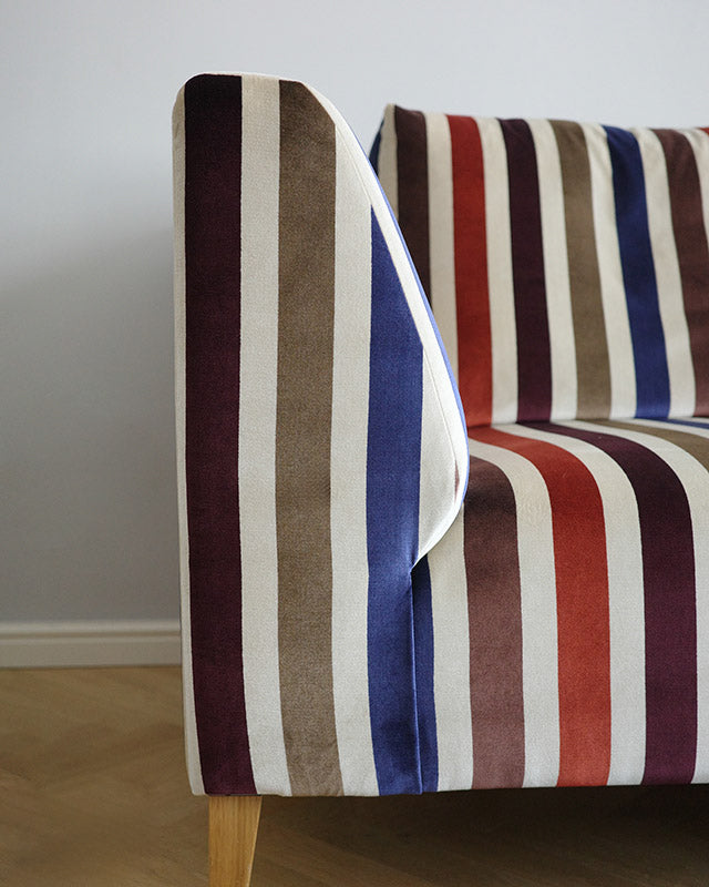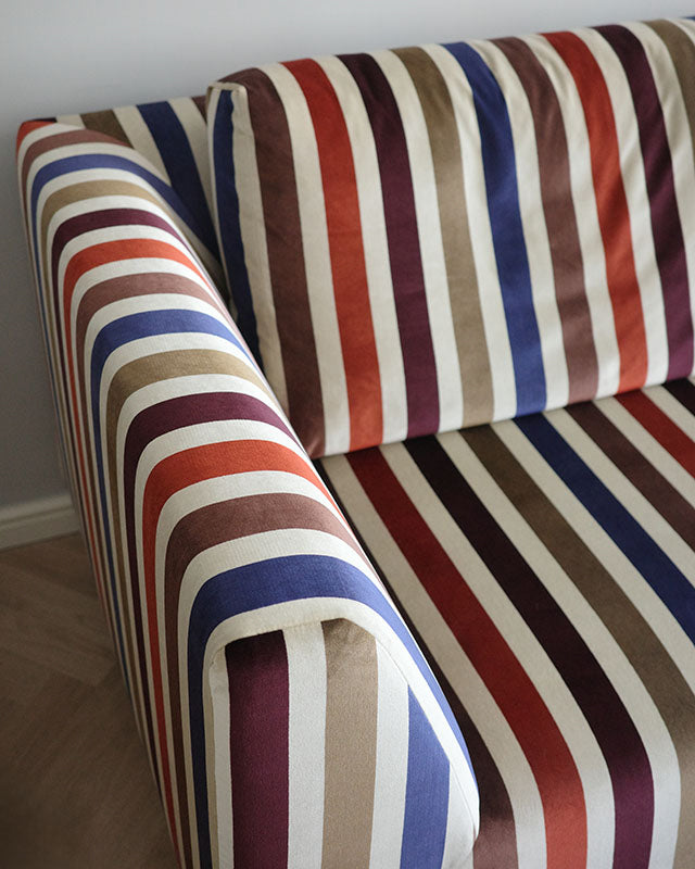 Priestrannú a pohodlnú sedačku sme prečalúnili do kvalitného pruhovaného zamatu. Pôsobí elegantne a zároveň hravo - skvele zapadne do maximalistického interiéru alebo ako výrazný akcent v minimalistickom priestore. Vankúše sú plnené kačacím perím a dajú sa odložiť, čím sa vytvorí veľká plocha na sedenie alebo na príležitostné spanie pre jedného človeka.