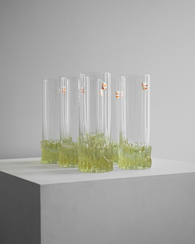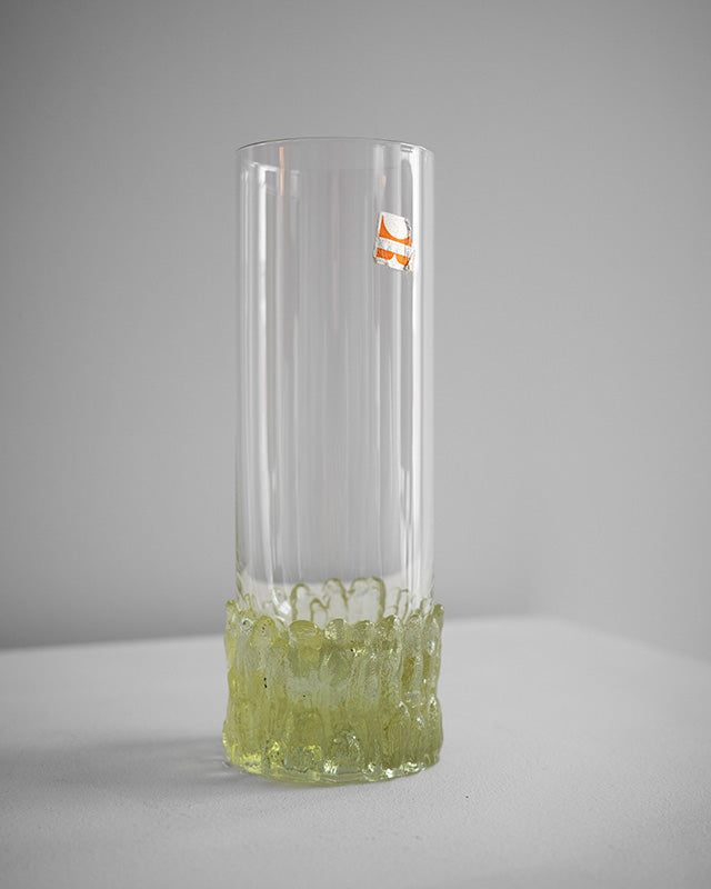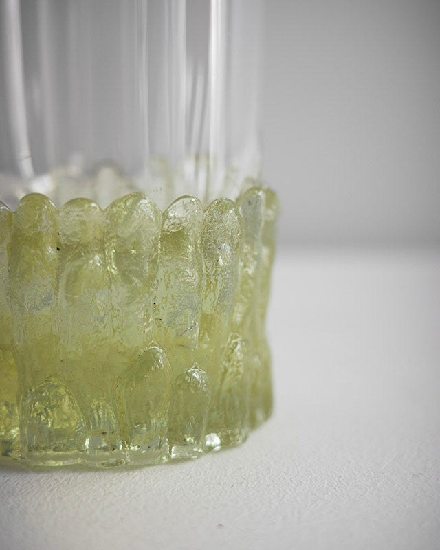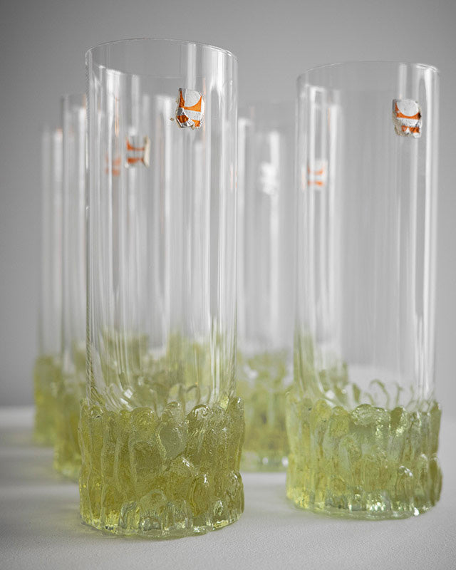 Venini poháre sú ukážkou spojenia talianskej sklárskej tradície a moderného dizajnu. Vysoké číre sklo kontrastuje s výrazným štruktúrovaným dnom v žlto-zelenom odtieni, ktoré dodáva pohárom jedinečný brutalistický charakter a zároveň funkčnú stabilitu.