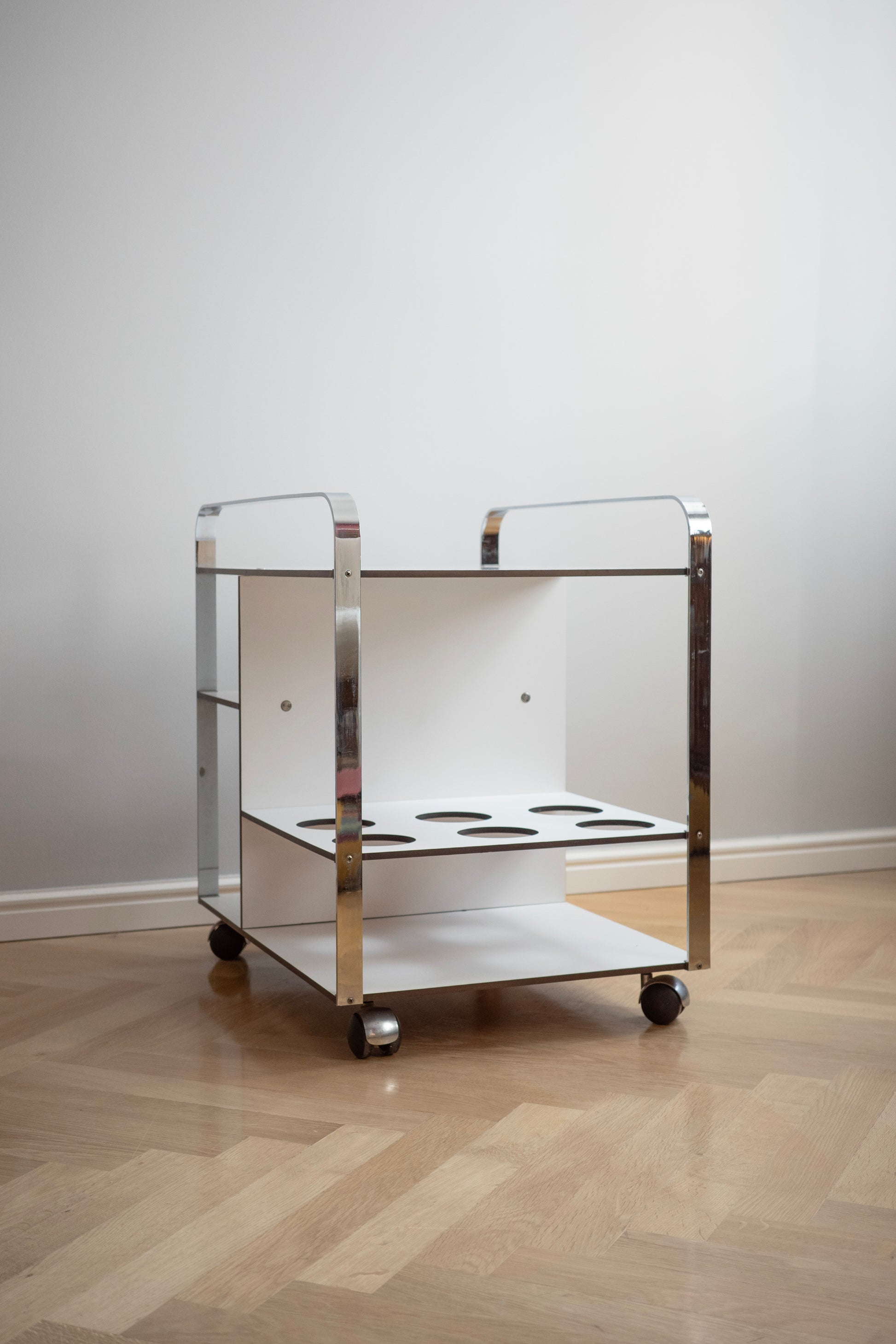 Architektonický servírovací vozík z 80. rokov s chrómovým rámom a bielymi policami. Má neobvyklé priehradky a držiak na fľaše, ktoré pripomínajú taliansky postmoderný štýl. Vozík je na kolieskach, ideálny ako mobilný bar alebo praktický doplnok.
