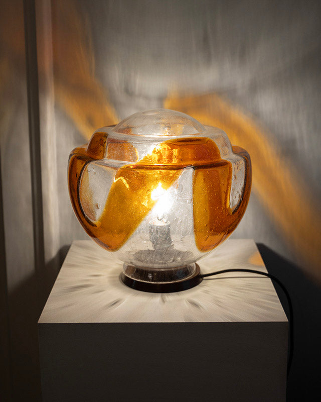Telo lampy je z ručne fúkaného číreho skla s vnútornými farebnými akcentmi v jantárovej farbe, položené je na tmavom podstavci. Štýlovo sa pohybuje na pomedzí mid-century modern a retro bohémskej estetiky.