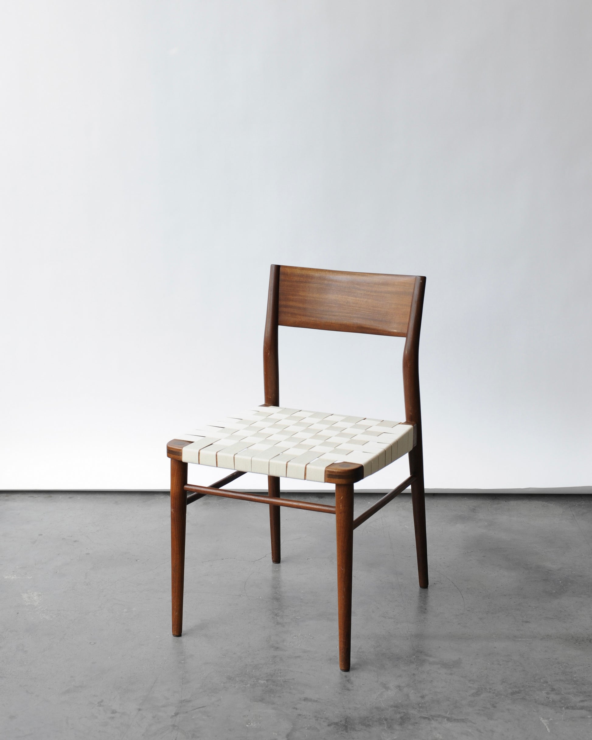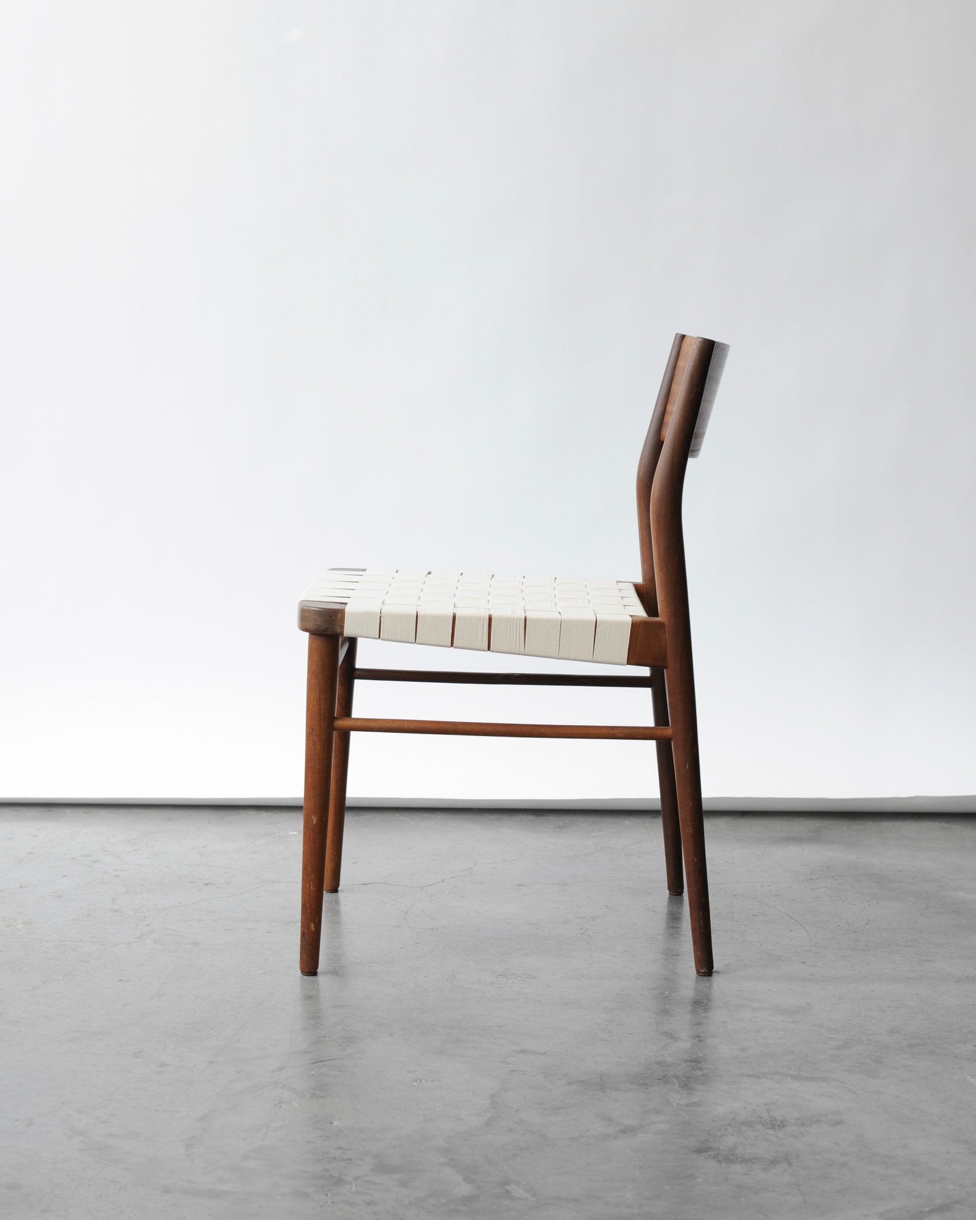 Stolička dostala označenie “model 351” a pochádza z Nemecka. Má konštrukciu z teakového dreva a sedák z látkového výpletu. Drevo je ošetrené.
