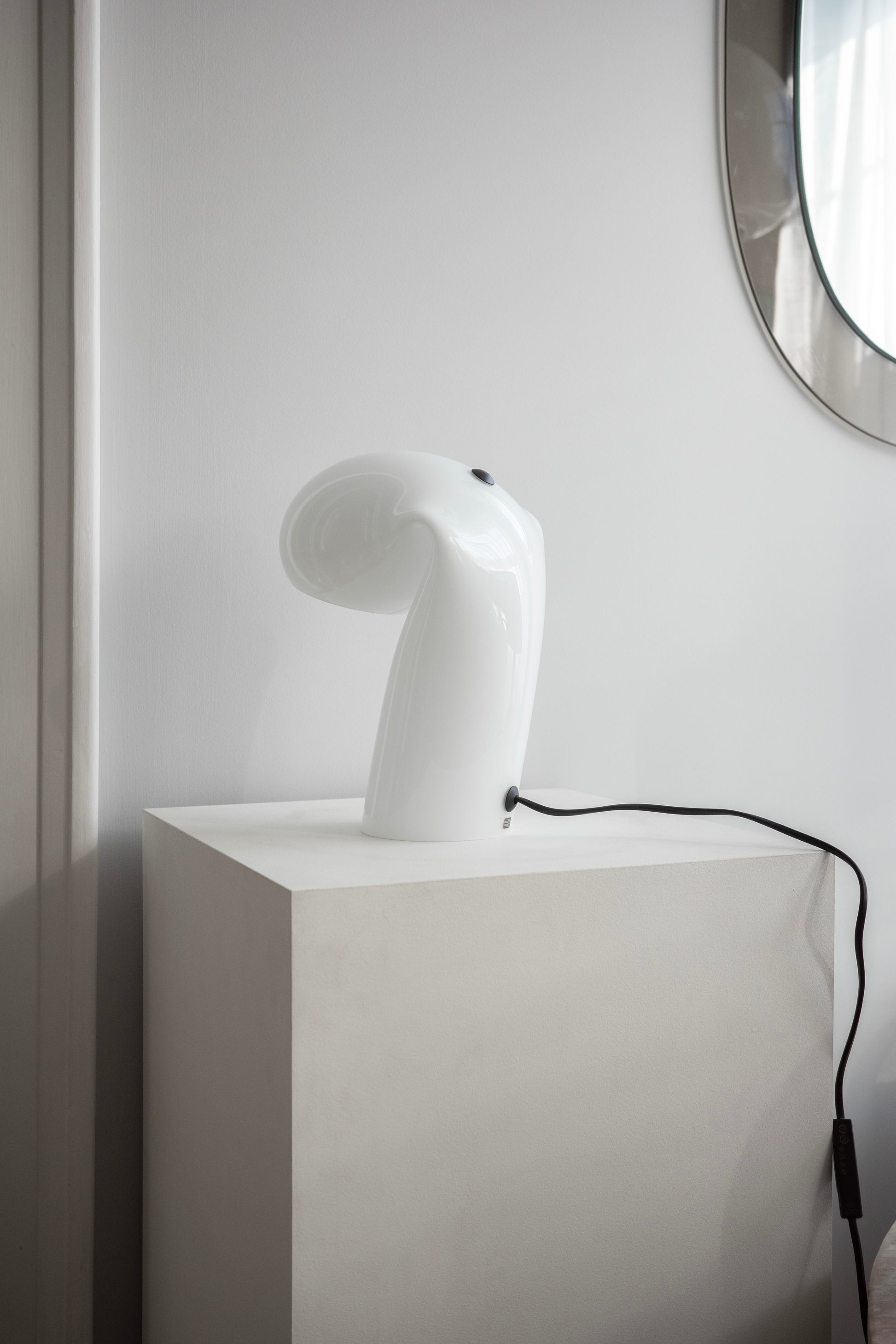 Stolová lampa Bissa bola navrhnutá v sklárni Vetreria Vistosi a vyrobená značkou Vistosi. Má jedinečný mäkký tvar a odráža čisté línie dizajnu, ktoré zvýrazňujú remeselnú kvalitu ručne vyrábaného skla. Vo výbornom vintage stave.