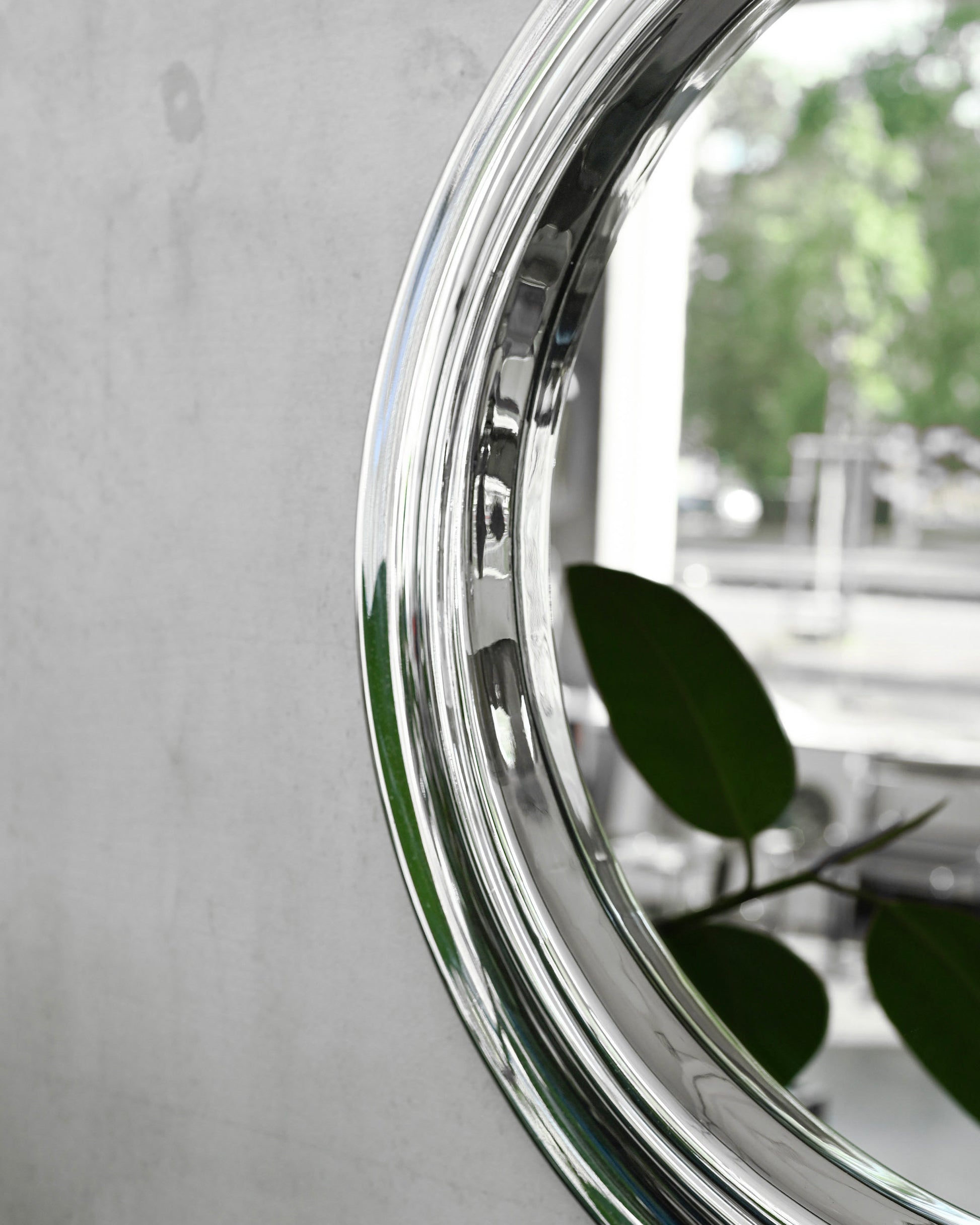 Zrkadlo má okrem striebornému rámu aj strieborné zrkadlo. Rám je vyrobený z plastu, zrkadlo pochádza z Talianska zo 70tych rokov. Je vo veľmi dobrom stave.