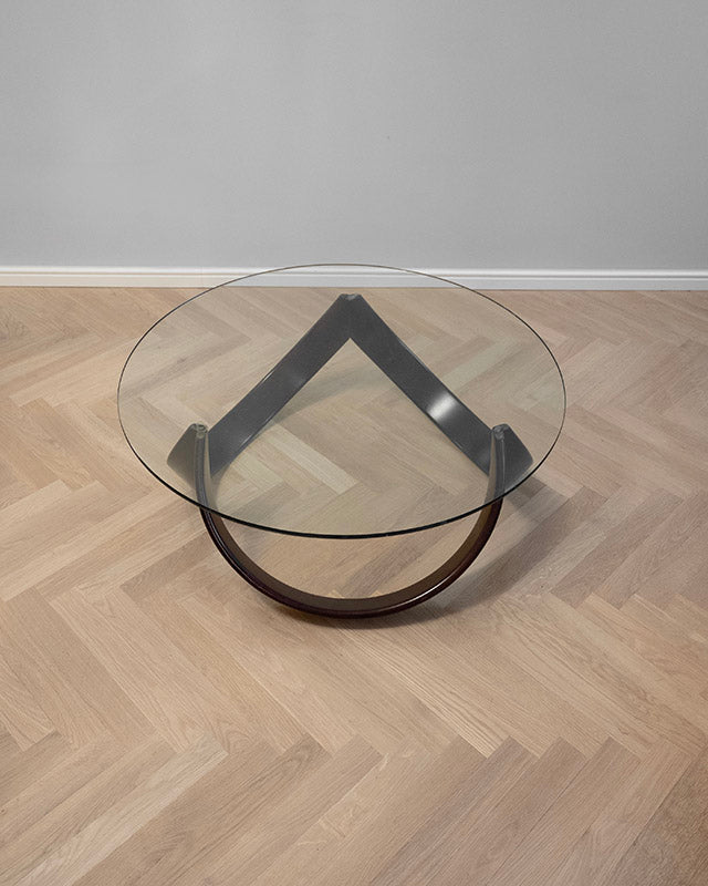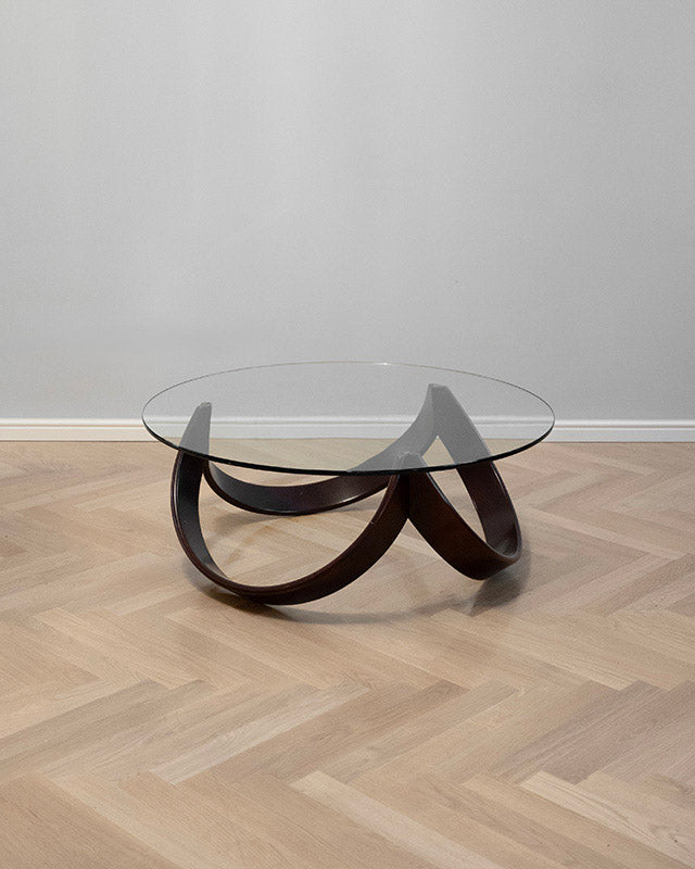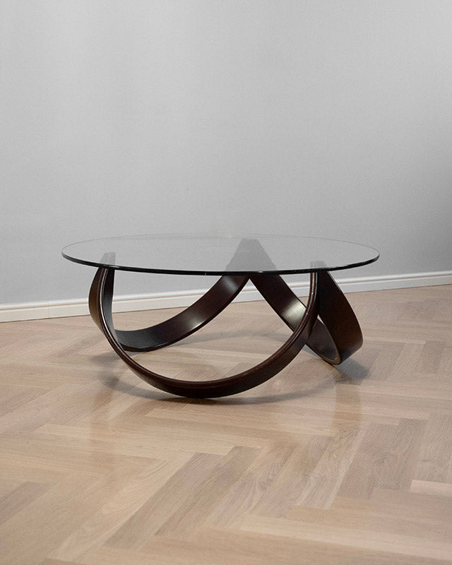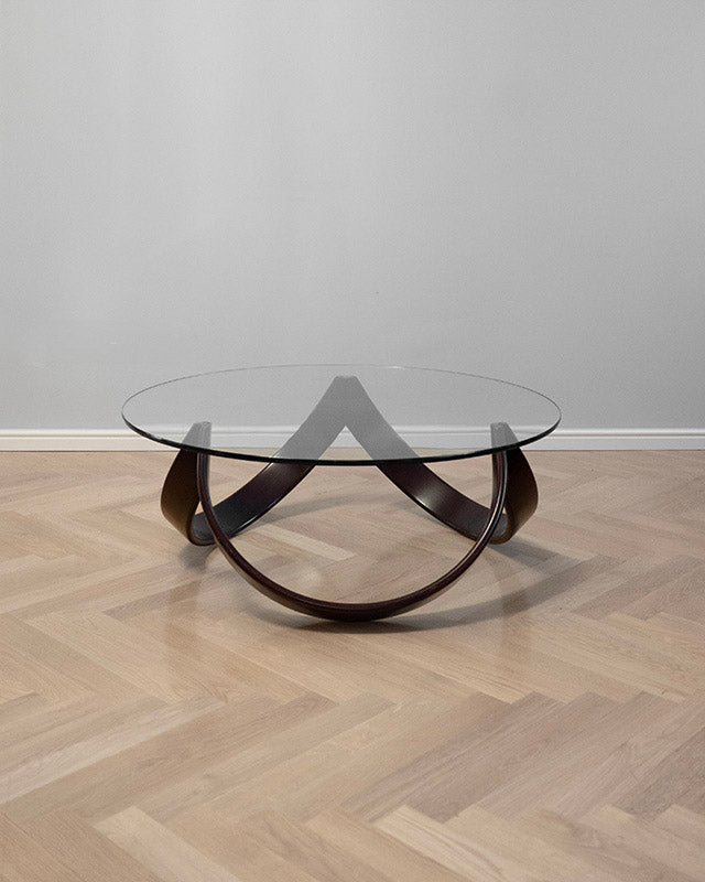 Konferenčný stolík pochádza 70. rokov, navrhnutý a vyrobený bol v Taliansku. Stolík má drevenú konštrukciu so zakrivenými nohami a číru sklenenú dosku z hrubšieho, pevného skla. Podnož je vyrobená z ohýbaného bukového dreva a je namorená do tmavšie hnedej farby.