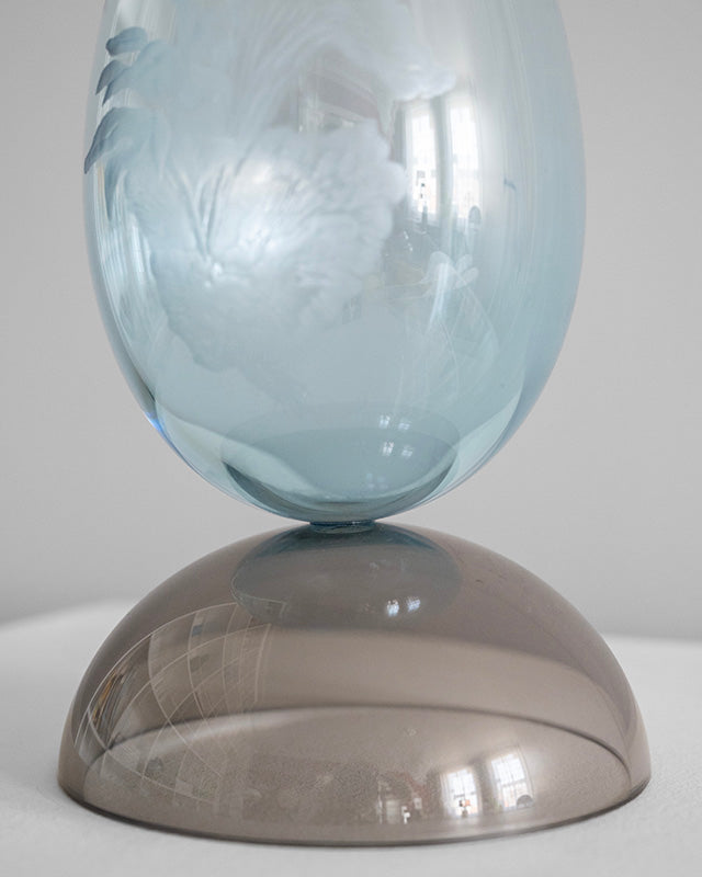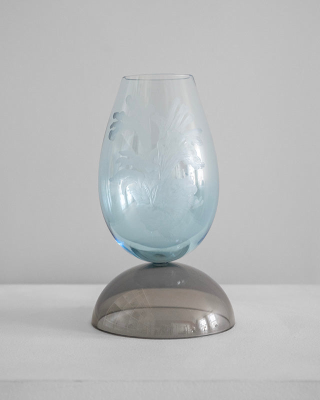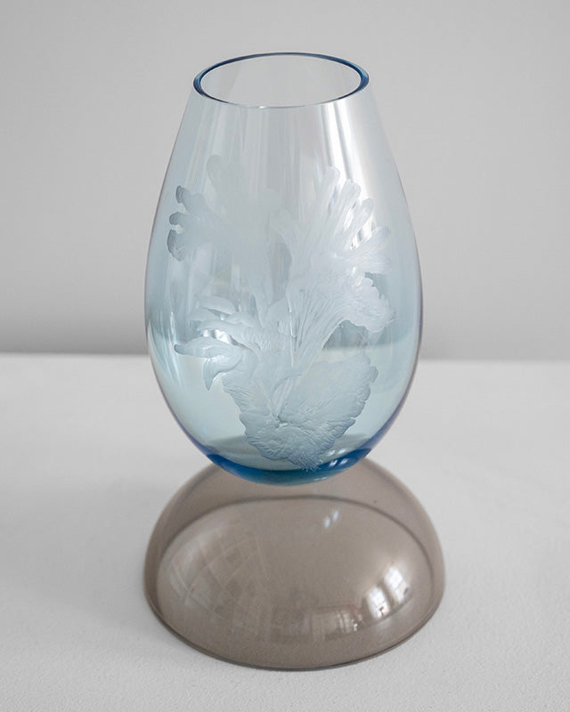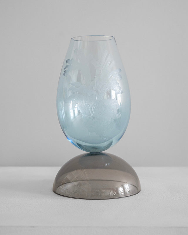 Sklenená váza s jemným modrastým tónom stojí na sivej základni. V modrej časti je ručná rytina s florálnym vzorom. Autorka je inšpiruje počas svojich ciest prírodou. Váza bola používaná len krátko, jedná sa o súčasný dizajn. Vhodná aj ako difuzér do interiéru. Je v 100% stave.