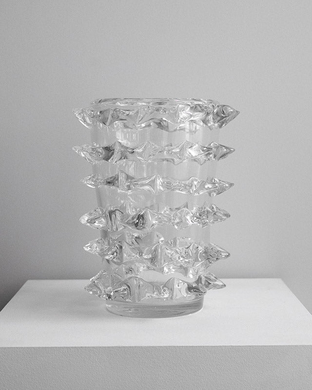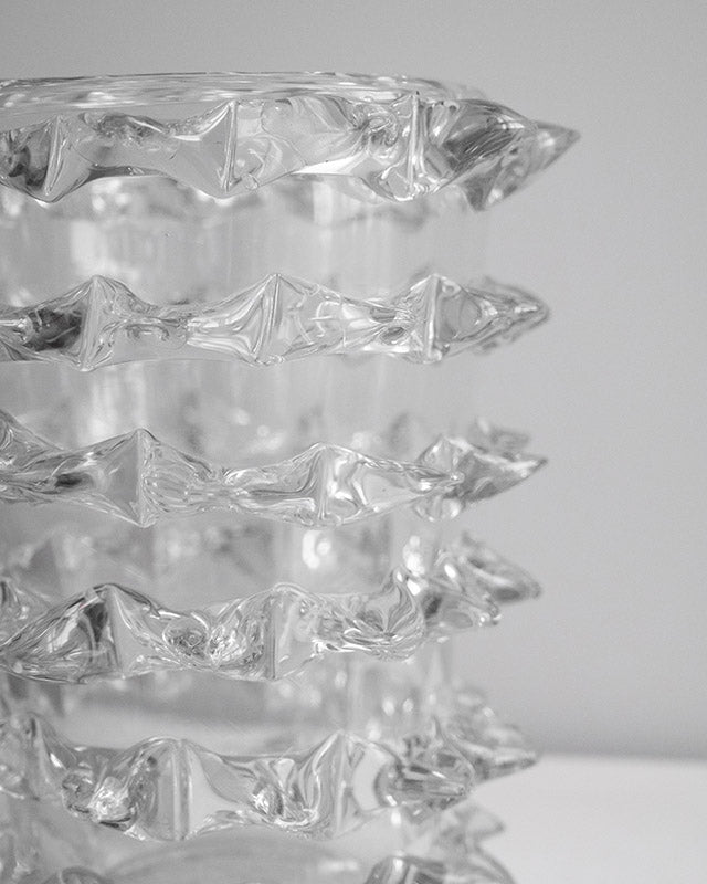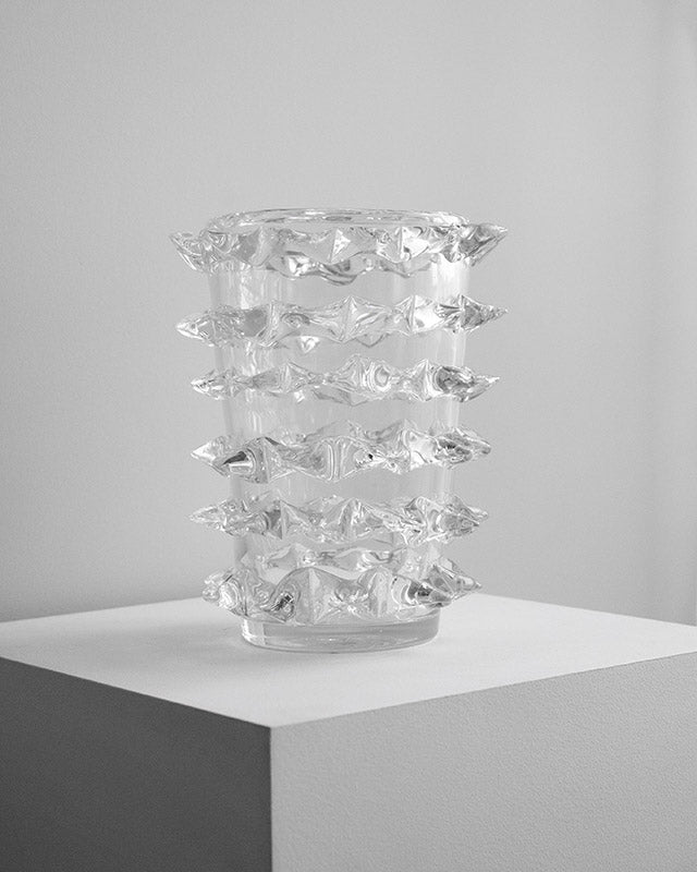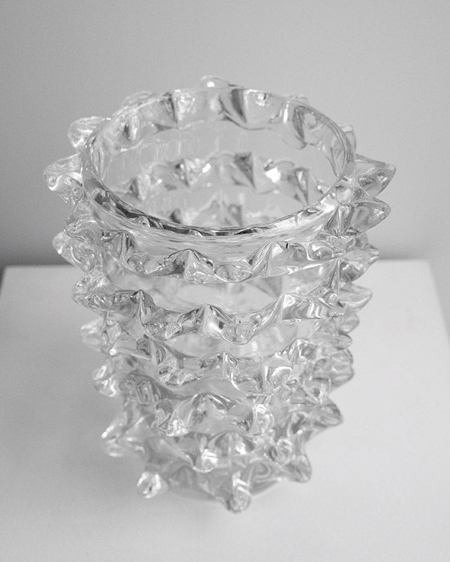 Váza je vyrobená z muránskeho skla v dizajne s názvom “rostrato” a pochádza z Talianska. Každý detail bol ručne vyhotovený majstrami sklármi. Technika rostrato znamená, že jednotlivé „hroty“ skla sú samostatne vrstvené do riadkov a vytvárajú výsledný tvar vázy.