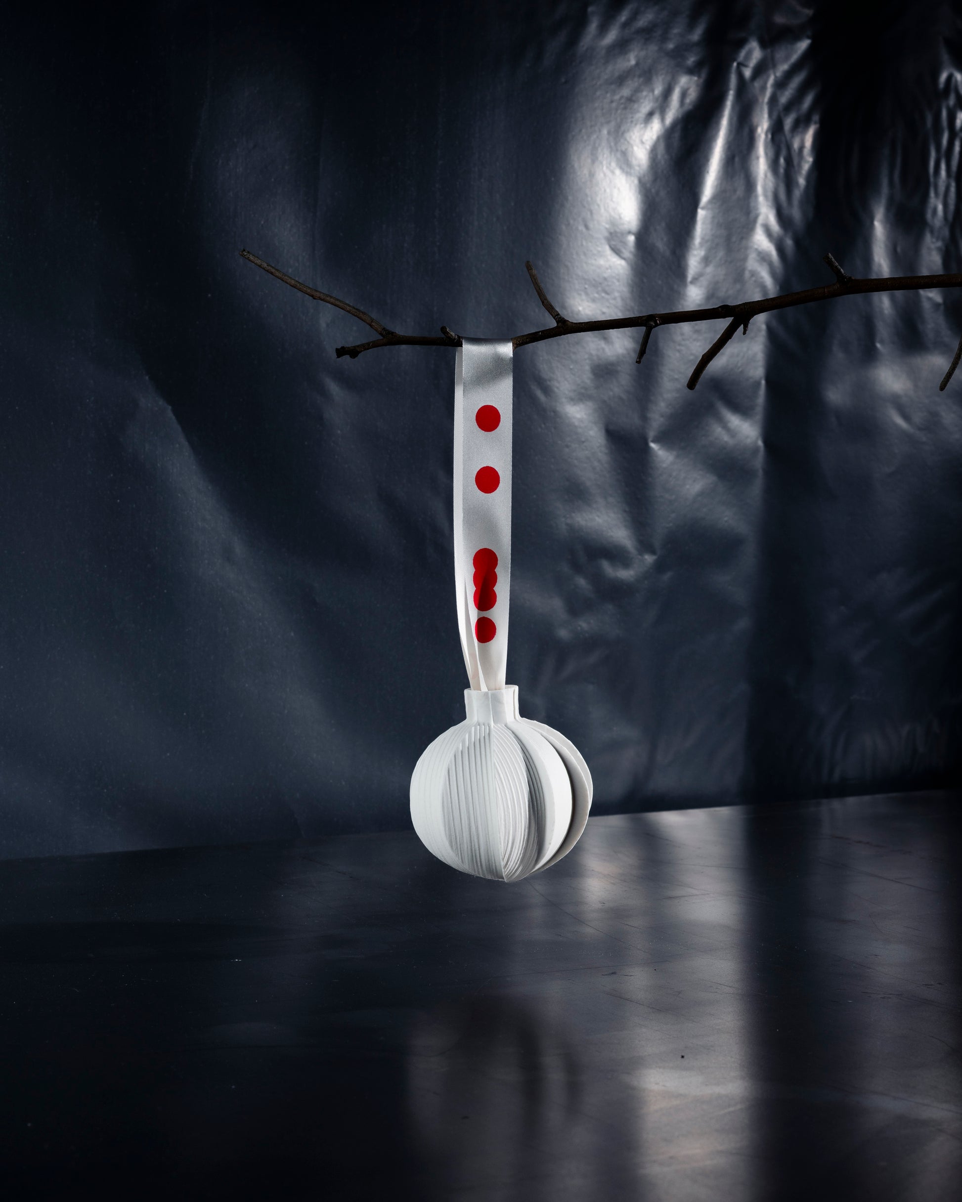 Vianočné ozdoby Segment sú dostupné v dvoch veľkostiach, každá s unikátnym reliéfom, ktorý vzniká spontánnymi variáciami pri výrobe. Tieto porcelánové gule dodajú vianočnému stromčeku eleganciu a osobitý šarm.