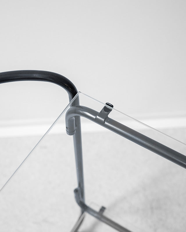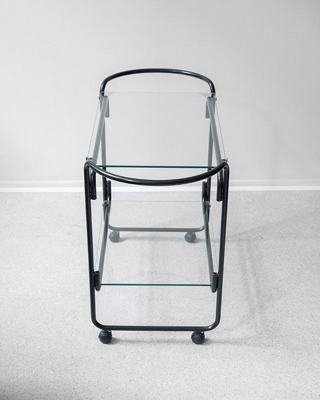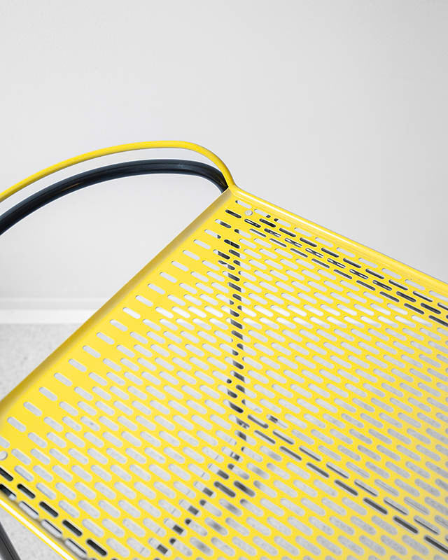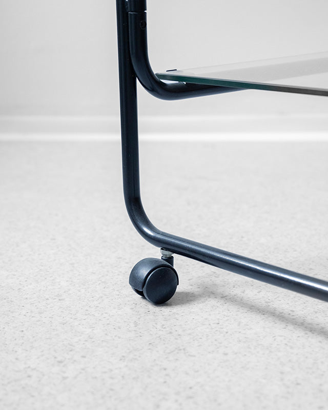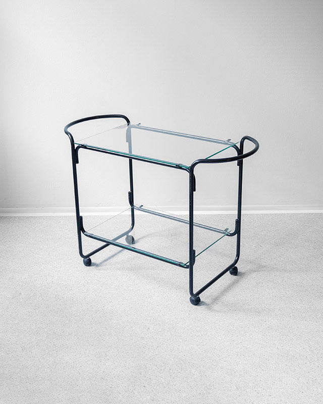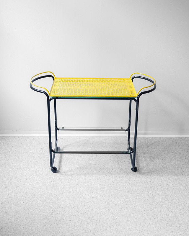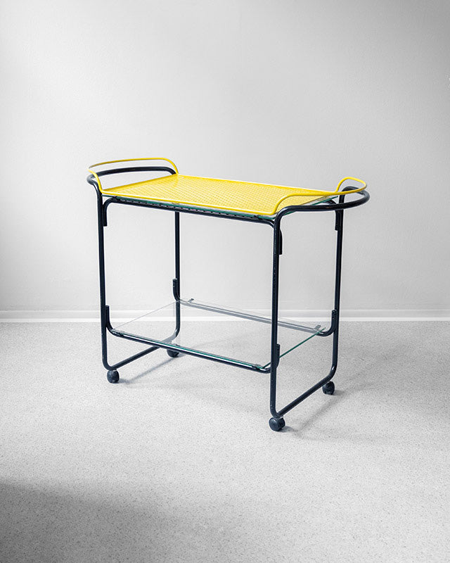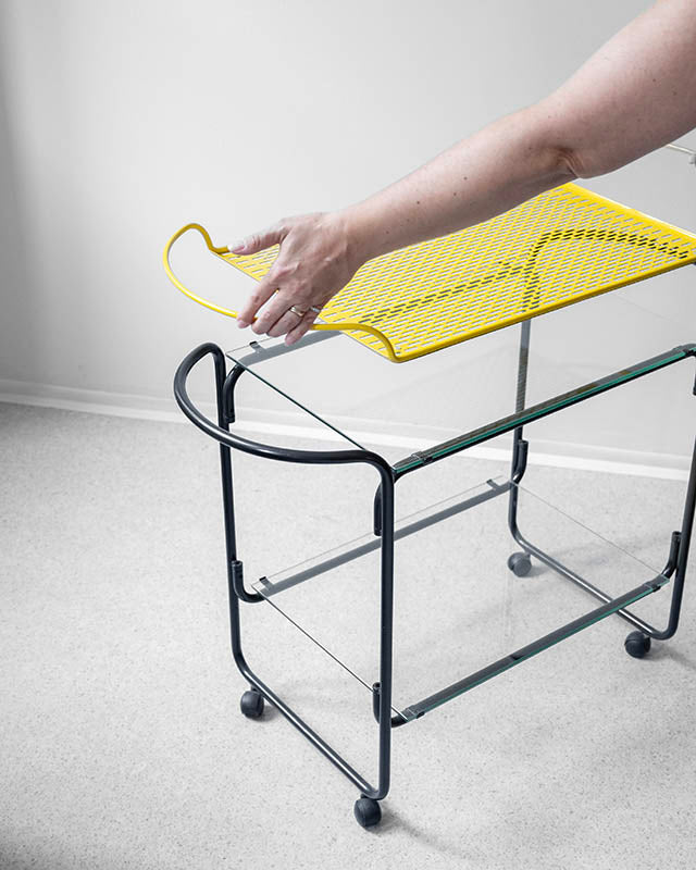 Servírovací vozík na kolieskach z Talianska z 80. rokov s čiernou kovovou konštrukciou, sklenenou doskou a odnímateľným žltým podnosom. Hravo praktický kúsok, ktorý poslúži ako mobilný bar aj odkladací stolík.
