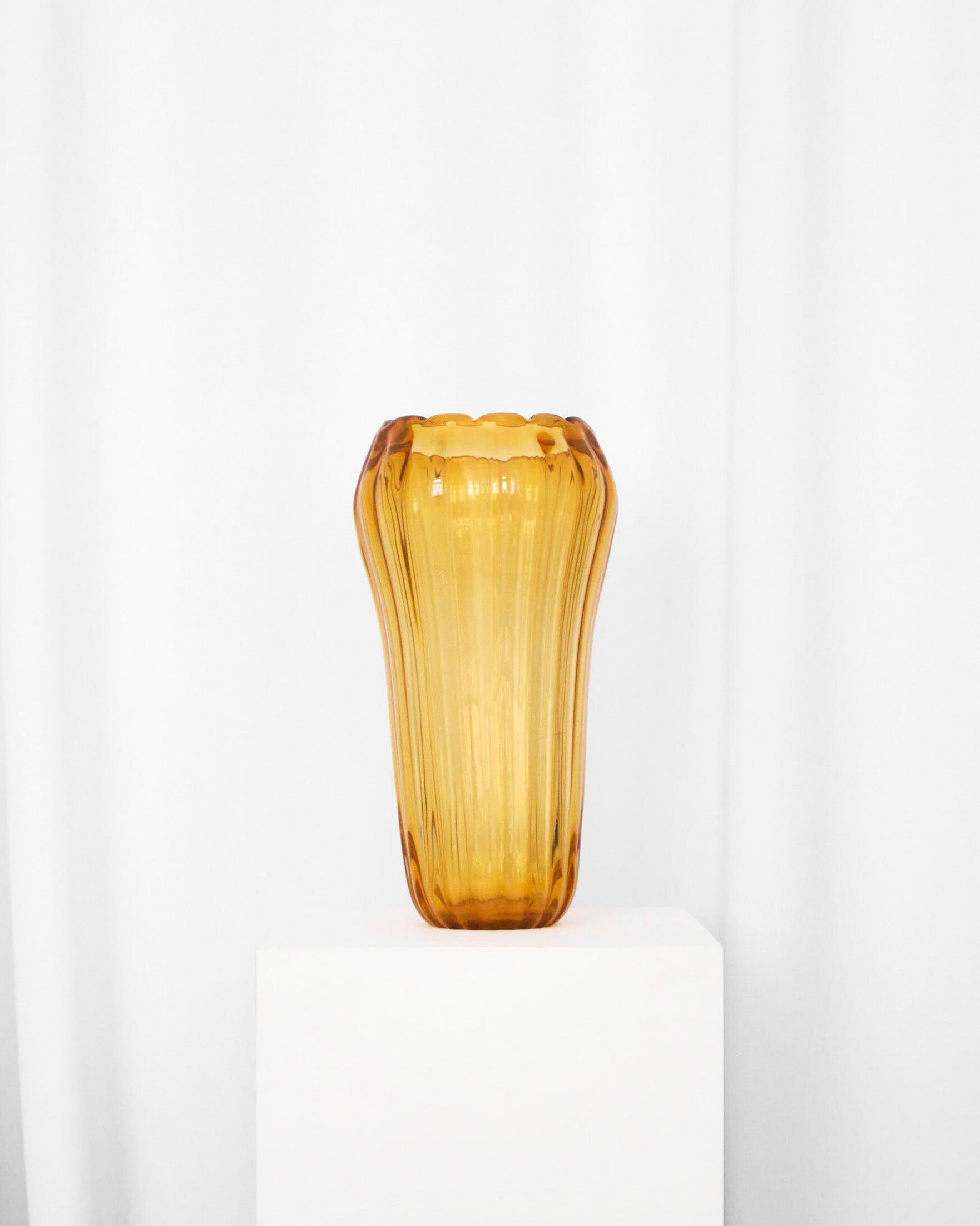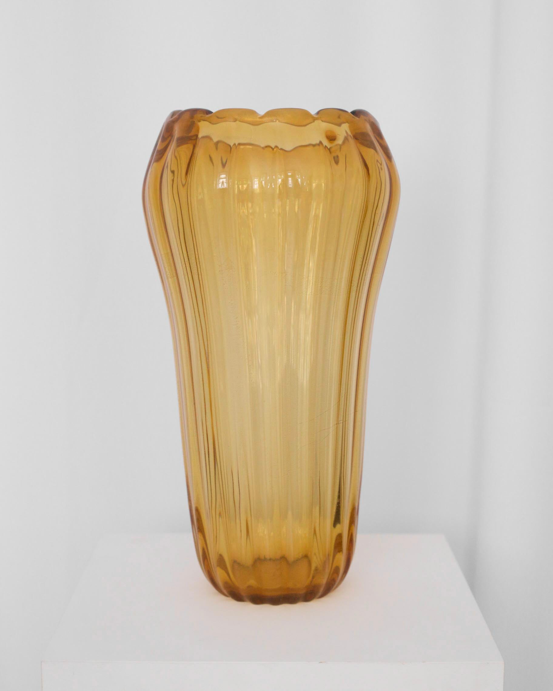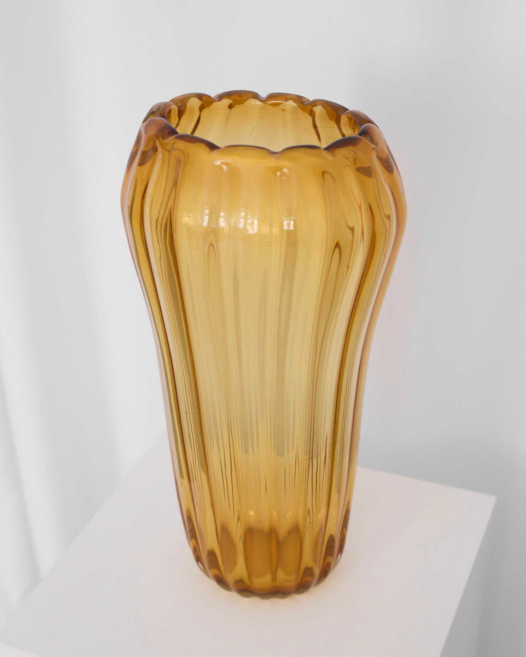 Váza ambrovej farby je vyrobená z hrubého muránskeho skla. Je vo výbornom stave, ako nová.