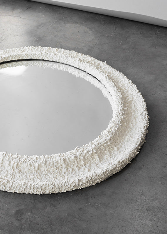 Vintage zrkadlo dotvorila umelkyňa Evgeniia Kazarezova, tvoriaca pod značkou ZHENI. Starý vintage kus, nespĺňajúci kritériá dnešného sveta ženúceho sa za dokonalosťou, bol pretvorený. Nie však renováciou jeho rámu alebo vyrezaním nového skla, ako to zvyčajne robíme. Ale nanesením niekoľkých vrstiev materiálu pod taktovkou Evgeniie. Zrkadlá už nie su len zrkadlami ale aj umeleckými objektmi, solitérmi v interiéri. Koncept vytvorenia série piatich zrkadiel vznikol pri vzájomnej debate Evgeniie a Vlaďy Ilavskej, zakladateľke štúdia LAVISH.
